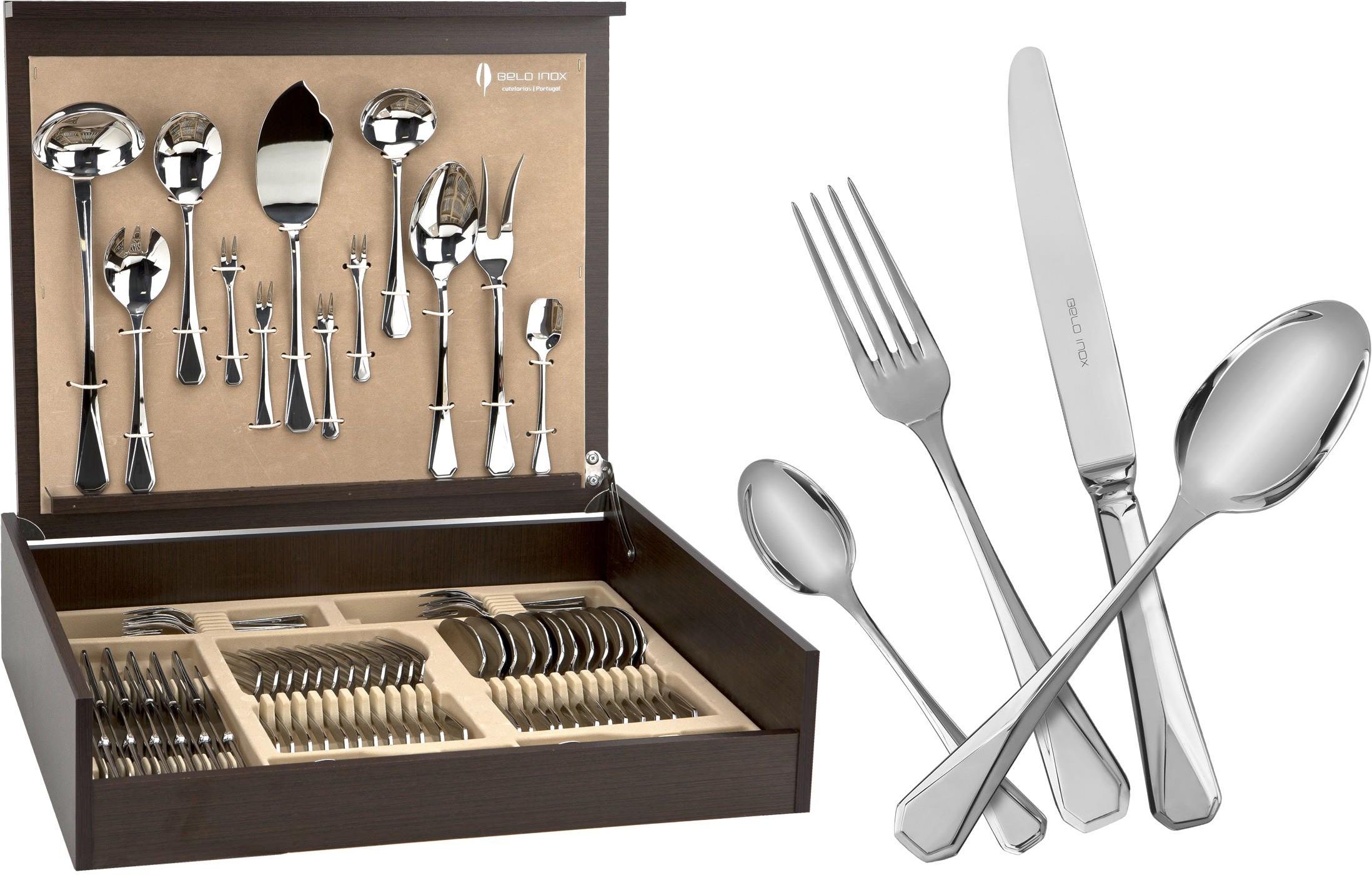 Elegancki komplet sztućców portugalskiej marki Belo Inox to połączenie klasyki i ponadczasowego stylu. Wykonane z wysokogatunkowej stali nierdzewnej, wyróżniają się subtelnym, geometrycznym zdobieniem na zakończeniach rękojeści. Dzięki temu doskonale prezentują się zarówno w codziennym użytkowaniu, jak i podczas wyjątkowych uroczystości. Charakterystyka Materiał: stal nierdzewna 18/10 polerowana na wysoki połysk Wzór: klasyczny, z eleganckim, fazowanym zakończeniem trzonka (wzór przypomina obrócony diament) Odporność: przystosowane do mycia w zmywarce Pochodzenie: produkcja portugalska – tradycja i precyzja Belo Inox Opakowanie: Kaseta drewniana Zestaw zawiera Komplet zapakowany jest w elegancką, drewnianą kasetę wyłożoną welurem, która chroni sztućce i sprawia, że stanowią również doskonały pomysł na prezent. W skład zestawu wchodzą: noże stołowe 12 szt widelce stołowe 12 szt łyżki stołowe 12 szt łyżeczki do herbaty/kawy 12 szt Widelczyk do ciasta 12 szt Łyżka wazowa 1 szt Widelczyk zakąskowy 4 szt Łopatka do tortu 1 szt Łyżka do serwowania 1 szt Widelec do serwowania 1 szt Widelec do sałatek 1 szt Łyżka do sałatek 1 szt Łyżeczka do cukru 1 szt Łyżka do sosu 1 szt Dlaczego warto wybrać Belo 3? Uniwersalny, elegancki design pasujący do każdej zastawy stołowej, trwałość i odporność na uszkodzenia, wysokiej jakości wykonanie potwierdzające renomę portugalskiej marki, luksusowe opakowanie – idealne na prezent ślubny, jubileuszowy czy do nowego domu. Zdjęcia aranżacyjne mają charakter poglądowy. Prezentowana aranżacja może zawierać elementy dekoracyjne niewchodzące w skład zestawu. Szczegóły dotyczące zawartości znajdują się w opisie produktu.