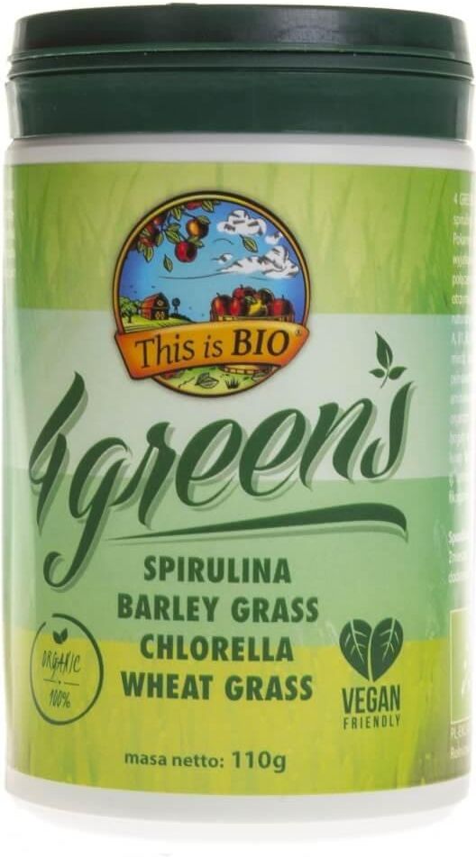 This is Bio 4 Greens 100% organic - 110 g 4 Greens od This is Bio, to preparat w proszku zawierający mieszankę czterech zielonych “super pokarmów” spiruliny, młodego jęczmienia, chlorelli i młodej pszenicy. Pokarmy te, każdy z osobna, od dawna stosowane są jako wyjątkowo cenne źródła składników …