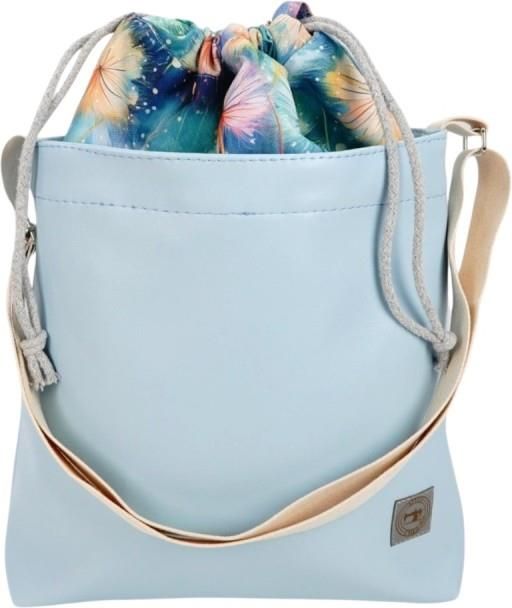Torebka błękitna z kominem i motywem dmuchawców – lekka i kobieca Poznaj wyjątkową torebkę błękitną z kominem i motywem dmuchawców – model, który łączy subtelność, funkcjonalność i styl handmade. To połączenie delikatnej błękitnej ekoskóry z kolorowym, wodoodpornym materiałem w motyw dmuchawców – idealne zestawienie na każdą porę roku. Torebka została uszyta z połączenia ekoskóry oraz wodoodpornego poliestru. Jest lekka, trwała i odporna na zabrudzenia. Główna komora zamykana jest na troczek (sznurek), który tworzy charakterystyczny komin – dzięki temu torba zyskuje niepowtarzalny wygląd. W środku znajduje się kieszonka zamykana na zamek, w której możesz schować najważniejsze drobiazgi. Dzięki regulowanemu paskowi dopasujesz długość torby do swojego stylu – możesz nosić ją na ramieniu lub przez ramię. Każdy egzemplarz to produkt handmade, szyty w Polsce z najwyższą starannością. Najważniejsze cechy produktu Wymiary: 37 cm (wys.) × 28 cm (szer.) × 7 cm (gł.) Długość paska: regulowana – od 64 do 112 cm Materiał: ekoskóra + poliester wodoodporny Zapięcie: troczek (komin ściągany sznurkiem) Kieszeń: wewnętrzna, zamykana na zamek Kolor okuć: srebrny Wielkość: duża – mieści format A4 Wykonanie: handmade – szyta w Polsce Dla kogo? Ta błękitna torba z kominem to doskonały wybór dla kobiet, które lubią połączenie delikatności i praktyczności. Świetnie sprawdzi się do pracy, szkoły czy na spacer. Motyw dmuchawców i pastelowy błękit nadają jej lekkości i kobiecego uroku 💙