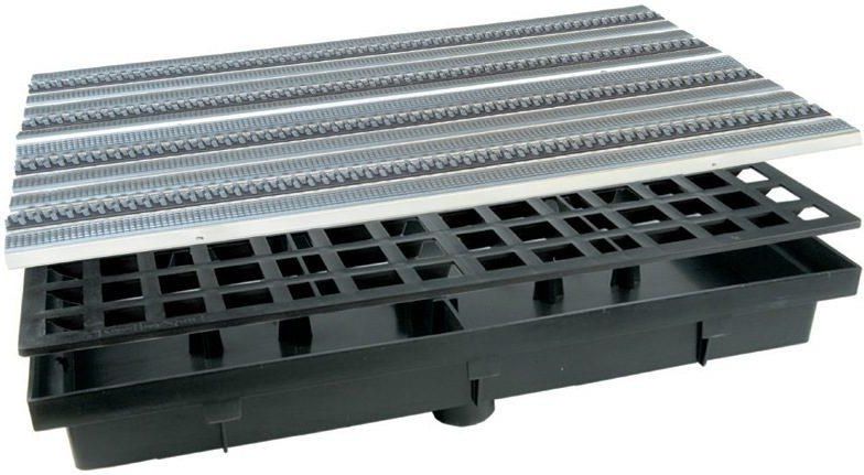 Wycieraczka z korytkiem plastikowym 60x40x10[cm] z rusztem plastikowym i szczotką/gumą na listwach aluminiowych Doskonała do montażu przed drzwiami wejściowymi domu, biura, hotelu, sklepu i innych miejsc. Korytko zbiera kurz, piasek, błoto oraz wodę, którą można odprowadzić przez podłączenie od spodu rury kanalizacyjnej średnicy 50 mm. Do wbudowania w kostkę brukową, bruk granitowy, płyty betonowe, kamień, wylewkę betonową, płytki gresowe, ceramiczne. Ruszt (kratka) plastikowa z gumową wycieraczką (szczotka, guma, listwy aluminiowe) zapewnia odpowiednią przyczepność obuwia oraz zabezpiecza przed wpadaniem i blokowaniem się obcasów w butach "szpilkach" Do korytka od spodu można podłączyć rury kanalizacyjne z mufą o średnicy DN50 [mm]. Produkt w 100% Polski. Kraj produkcji Polska. Wycieraczka przeznaczona jest do punktowego zbierania zanieczyszczeń i odprowadzenia wody z strefy wejściowej do budynków. Tylko pod ruch pieszy, nie nadaje się pod ruch samochodowy. Specyfikacja: Wysokość: 70 mm (bez króćca pod rurę). Szerokość: 408 mm Długość: 600 mm Waga korytka: 1250 g Waga rusztu i wycieraczki szczotkowej: 3850 g Waga kompletu: 5100 g Nie może być stosowana pod ruch samochodowy!!! Rysunek techniczny wycieraczki: Wycieraczka z korytkiem do odprowadzania - idealna do montażu przed drzwiami wejściowymi każdego domu, biura, hotelu, sklepu i wielu innych miejsc. Zbiera kurz, piasek, błoto oraz wodę, którą można odprowadzić przez podłączenie od spodu rury kanalizacyjnej. Produkt wykonany jest z najlepszej jakości materiałów i został zaprojektowany z myślą o zapewnieniu maksymalnego komfortu użytkowania. Budowa wycieraczki to korytko z plastiku o wymiarach 60x40x10[cm], ruszt plastikowy z wycieraczką szczotka-guma oraz mufa o średnicy DN50 [mm]. Wycieraczka została wyprodukowana w 100% w Polsce, przez co możesz mieć pewność, że posiadasz produkt najwyższej jakości, od producenta, który dba o każdy szczegół. Jednak pamiętaj - wycieraczka ta jest przeznaczona tylko do ruchu pieszych, nie nadaje się pod ruch samochodowy. Nie zwlekaj, zamów już dziś oraz ciesz się zawsze czystymi butami!