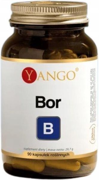 Bor 90 kapsułek Suplement diety Bor to rzadko wspominany, ale ważny pierwiastek śladowy, który naturalnie występuje w organizmach żywych – głównie w kościach i tkankach miękkich. Choć jego ilość w organizmie jest niewielka, bor może wspierać codzienną dietę i być jej cennym uzupełnieniem, szczególnie w kontekście rosnącego zainteresowania równowagą mineralną i świadomą suplementacją. 3 mg boru w porcji dziennej – w przyswajalnej formie boranu sodu Odpowiedni dla wegan – kapsułki roślinne Bez dodatków syntetycznych i zbędnych wypełniaczy Suplement diety opracowany z myślą o codziennym uzupełnianiu diety Bor to pierwiastek, który w organizmie człowieka występuje w ilościach śladowych – jednak jego obecność stwierdza się głównie w układzie kostnym oraz tkankach miękkich. Choć nie został jeszcze oficjalnie uznany za składnik niezbędny dla zdrowia, jego suplementacja cieszy się popularnością wśród osób świadomie wspierających organizm minerałami śladowymi. Każda kapsułka preparatu zawiera 26,6 mg boranu sodu, w tym 3 mg czystego boru. Suplement nie zawiera konserwantów, barwników ani sztucznych dodatków technologicznych. Wykorzystane kapsułki są w 100% roślinne, co czyni preparat odpowiednim także dla wegan i wegetarian. Dlaczego warto sięgnąć po Bor od YANGO? Uzupełnienie codziennej diety o śladowy pierwiastek — bor. 3 mg boru w każdej kapsułce — przemyślana, bezpieczna porcja. Przejrzysty skład — bez dodatków, wypełniaczy i alergenów. Odpowiedni dla wegan — kapsułki celulozowe. Suplement diety produkowany w Polsce. Produkt może być wskazany dla osób zainteresowanym uzupełnieniem diety w pierwiastki śladowe, prowadzącym dietę ubogą w bor (np. niskoborowa woda i żywność przetworzona), dbającym o codzienną równowagę mineralną w diecie, szukającym prostego i czystego składu suplementu. Jak stosować Bor w kapsułkach? Zalecane spożycie to 1 kapsułka raz dziennie, po posiłku. Kapsułkę należy połknąć i popić dużą ilością wody. Nie należy przekraczać zalecanej porcji dziennej. Suplement diety nie może być stosowany jako substytut zróżnicowanej diety i zdrowego stylu życia. Składniki substancja wypełniająca: celuloza mikrokrystaliczna; boran sodu (bor). Składnik aktywny 1 kapsułka Boran sodu 26,6 mg w tym bor (11,3%) 3 mg Masa netto 29,7 g Suplementy diety nie mogą być stosowane jako substytut (zamiennik) zróżnicowanej diety ani zdrowego trybu życia. Nie należy przekraczać zalecanej porcji produktu do spożycia w ciągu dnia. Suplementy diety powinny być przechowywane w sposób niedostępny dla małych dzieci. Przed zastosowaniem produktu sugerujemy zapoznanie się z dokładnymi informacjami podanymi na opakowaniu lub załączonej ulotce. Warunki przechowywania Przechowywać w szczelnym opakowaniu. W suchym i chłodnym miejscu, w sposób niedostępny dla dzieci. Chronić przed światłem. Producent Yango Sp. z o.o. ul. Granitowa 3/14, 02-681 Warszawa