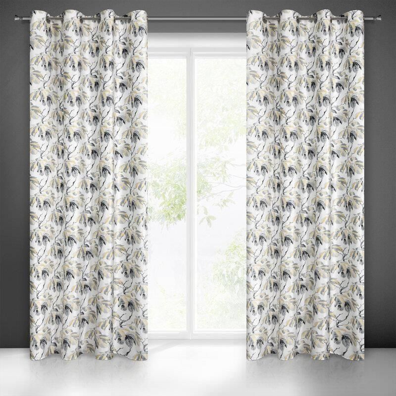Gotowa zasłona na kółkach 140X250 biała wzór liści modna Eurofirany Aukcja dotyczy sprzedaży jednej sztuki Polecamy zasłonę MELISA, którą zdobi oryginalny nadruk liści kasztanowca w niezwykłej szaro-musztardowej kolorystyce, naniesiony na kontrastujące białe tło. Zasłonaz przyjemnej w dotyku …
