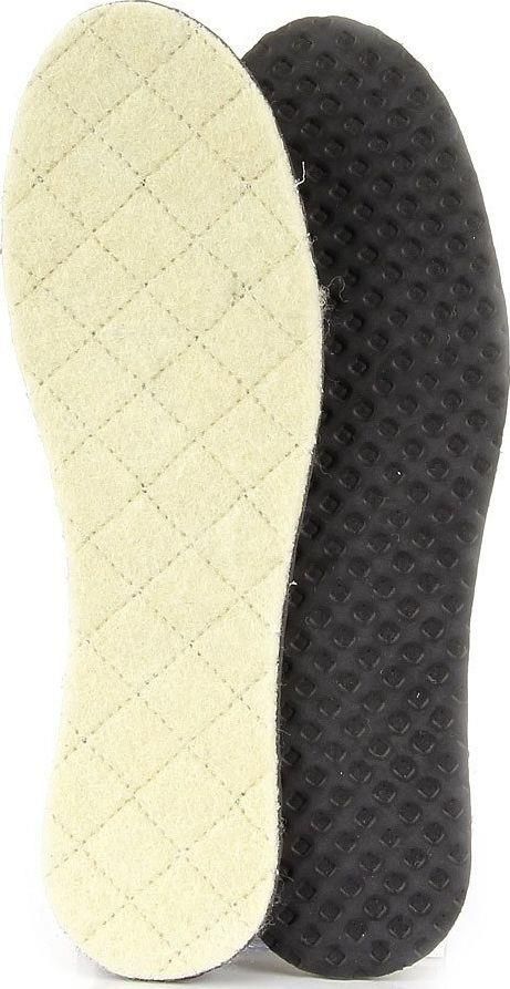 Wkładka termiczna 3-warstwowa. Warstwa ocieplająca to pikowana dla zwiększenia trwałości wełna owcza (100 %), pod nią warstwa folii aluminiowej utrzymująca temperaturę. Spodnia warstwa - pianka lateksowa z węglem aktywnym pochłania nieprzyjemne zapachy a profil w kształcie gofra zapobiega przesuwaniu się wkładki. Innowacyjne połączenie materiałów oprócz ochrony stóp przed zimnem wspomaga amortyzację, zapobiegając bólom stóp i kręgosłupa. ELEMENTY: wełna owcza 100%, folia aluminiowa, lateks z węglem aktywnym