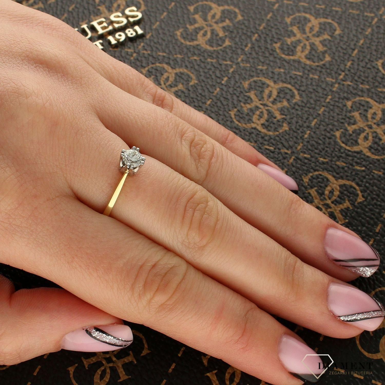 Złoty pierścionek " Diamenty w białym złocie " 585 DIAMENT 1844WG/40. Biżuteria wykonana z żółtego i białego 14 karatowego złota z 3 Diamentami osadzonymi w oprawie z białego złota. Biżuteria idealna na zaręczyny. Pierścionek wykonany z złota próby 585 z 3 Diamentami oprawionym w koronkę z białego …