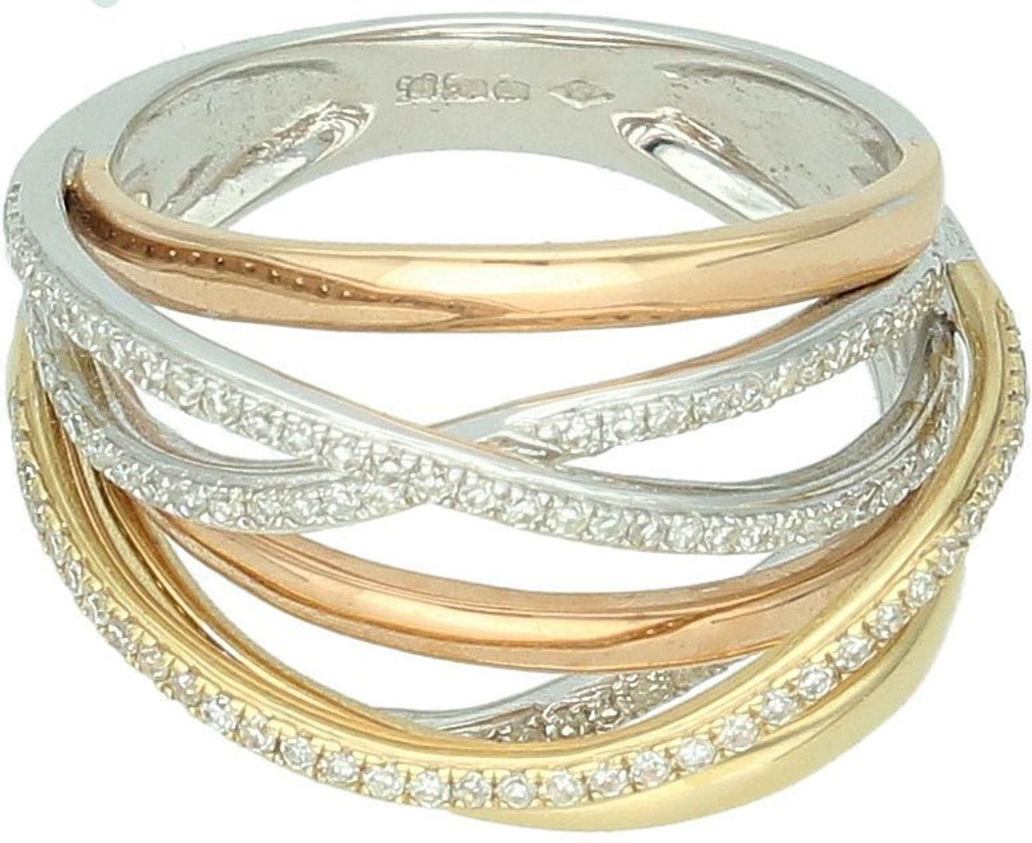Szeroki złoty pierścionek z diamentami 585 Trzy kolory złota. Pierścionek wykonany ze złota próby 585- w większości z białego złota, z dodatkiem żółtego i różowego. W pierścionku osadzono 129 brylantów o łącznej masie 0,51 ct, barwie H oraz czystości SI. Piękny pierścionek ozdobiony brylantami o …