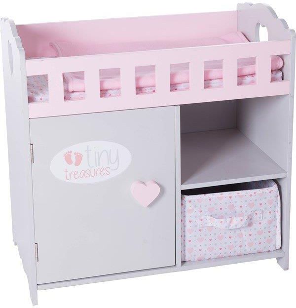 Tiny Treasures Wooden Baby Care Centre with mattress, fabric drawer and blanket. Wooden furniture designed for Tiny Treasures baby doll. Includes crib...