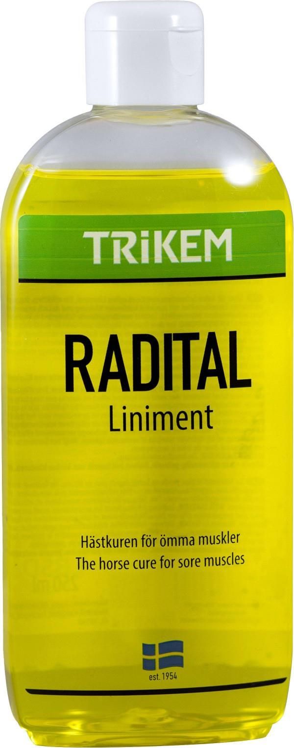 "Radital Liniment jest popularnym mazidłem stosowanym u zwierząt i ludzi od ponad 65 lat. Radital zapewnia początkowo uczucie chłodzenia, które przechodzi w przyjemne ciepło. Wcierać i masować napięte mięśnie i stawy. 96-godzinny zakaz startów dla koni".