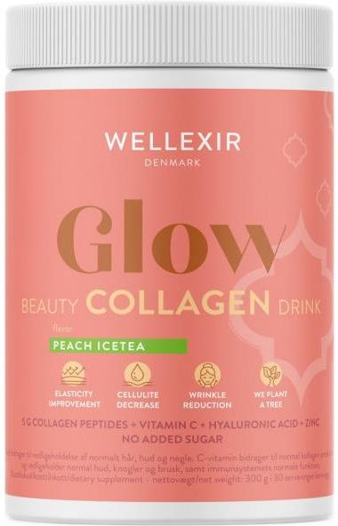 Glow Beauty Drink duńskiej marki Wellexir to idealne połączenie odświeżającego napoju o smaku mrożonej herbaty brzoskwiniowej (Peach Ice Tea) oraz zaawansowanego kompleksu beauty. Suplement został stworzony w celu wsparcia elastyczności skóry, wzmocnienia włosów oraz paznokci. Forma proszku pozwala na szybkie przygotowanie smacznego napoju, który łatwo wkomponować w codzienny rytuał pielęgnacyjny. Działanie składników aktywnych: Kolagen morski/peptydowy: Dostarcza organizmowi aminokwasów niezbędnych do utrzymania jędrności skóry i struktury tkanki łącznej. Witamina C: Odgrywa kluczową rolę w prawidłowej produkcji kolagenu w organizmie oraz chroni komórki przed stresem oksydacyjnym. Cynk: Pomaga zachować zdrową skórę, włosy i paznokcie, a także wspiera prawidłowe funkcjonowanie układu odpornościowego. Kwas hialuronowy: Wspomaga wiązanie wody w głębokich warstwach skóry, zapewniając jej nawilżenie i efekt zdrowego blasku. Skład (1 porcja – 6 g): Kolagen hydrolizowany. Witamina C (kwas L-askorbinowy). Cynk (glukonian cynku). Naturalny aromat (brzoskwiniowa mrożona herbata). Sposób użycia: Dorośli (powyżej 18. roku życia): wsypać jedną porcję (6 g) do szklanki wody (ok. 200–250 ml), wymieszać i wypić. Zaleca się spożywać jedną porcję dziennie.