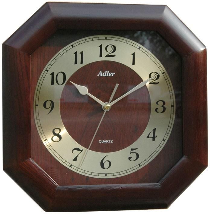 Zegar ścienny drewniany kwarcowy Adler Klasyczny drewniany zegar ścienny z mechanizmem zasilanym na baterie. Klasyczna ośmiokątna obudowa. Tarcza w formie obręczy, wykonana z metalu w kolorze złotym. Wysokość: 28,5 cm Szerokość: 28,5 cm Głębokość: 4 cm Waga: 800 g Materiały: drewno, metalowe części koloru złotego (tarcza), szyba szklana transparentna Tarcza: metalowa obręcz z cyframi koloru złotego, cyfry czarne, stylizowane, arabskie Wskazówki: godzinowa, minutowa i sekundowa, wskazówki złote, proste zakończone strzałkami Mechanizm zegara: kwarcowy, 1 bateria R16 (paluszek; nie załączona) Mocowanie na ścianie: otwór w plastikowej obudowie mechanizmu z tyłu zegara 2 lata gwarancji