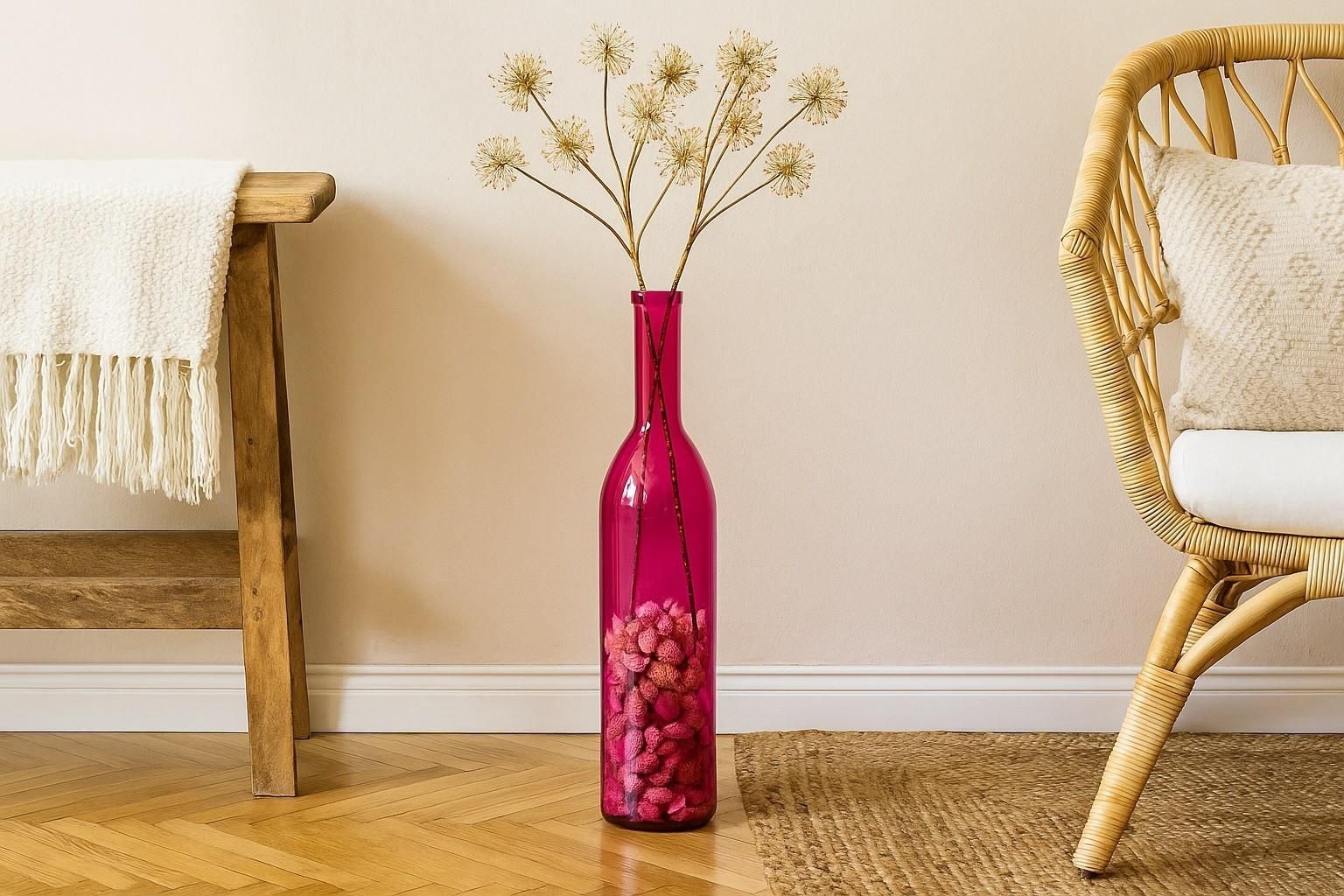 Wazon szklany z recyklingu 100 cm, kolor różowy– San Miguel Dodaj wnętrzu energetycznej elegancji dzięki wysokiemu wazonowi San Miguel w przyjemnym odcieniu różu. Butelkowy kształt o wysokości 100 cm i subtelny połysk szkła sprawiają, że ten dekoracyjny element przyciąga wzrok w każdym pomieszczeniu – od salonu, przez jadalnię, aż po przestrzeń eventową. Szkło z recyklingu – ekologiczny wybór ✔ Wysokość 100 cm – idealny do pojedynczych gałązek lub suchych bukietów ✔ Ręczne wykonanie – każdy egzemplarz jest nieco inny Propozycje aranżacyjne: – Postaw wazon solo na podłodze przy sofie lub regale jako akcent kolorystyczny – Uzupełnij go złotymi lub kremowymi trawami pampasowymi dla eleganckiego kontrastu – Stylizuj z jasnymi ścianami lub beżowym tłem – podkreślą głębię koloru ? Idealny do wnętrz glamour, nowoczesnych i eklektycznych Dodaj szklany wazon San Miguel do koszyka i postaw na design w zgodzie z naturą! Zdjęcie tytułowe ma charakter poglądowy. Prezentowana aranżacja może zawierać elementy dekoracyjne niewchodzące w skład zestawu. Szczegóły dotyczące zawartości znajdują się w opisie produktu.