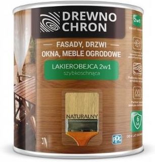 Lakierobejca 2w1 BEZBARWNA 0,2 przeznaczona jest do dekoracyjno – ochronnego malowania przedmiotów drewnianych i drewnopochodnych na zewnątrz oraz wewnątrz pomieszczeń. _ ✅ Pojemność: 0,20 l ✅ Wydajność: 14m2/l ✅ Kolor: BEZBARWNA Dane techniczne: • Wydajność: do 14m2/l przy jednej warstwie • Zalecana ilość warstw: 1-2 Najważniejsze zalety: • 2 w 1 impregnuje i dekoruje • przyjemne, łatwe malowanie • odporna na działanie promieni UV • odporna na zmienne warunki atmosferyczne • podkreśla naturalne usłojenie drewna • do wnętrz i na zewnątrz • pachnie lasem podczas malowania • do 6 lat ochrony powłoki dla powierzchni pionowych, w zależności od warunków eksploatacji Transparentna lakierobejca nadaje eleganckie, satynowe wykończenie, podkreślając naturalne usłojenie drewna. Na zewnątrz: podbitki, płoty, meble ogrodowe, drzwi, okna, elewacje drewniane, altanki, domki letniskowe. Wewnąrz: drzwi, okna, boazerie. Sposób stosowania: Przygotowanie podłoża Podłoże wyrównaj, przeszlifuj, odpyl, odtłuść wodnym roztworem detergentu (detergent po zastosowaniu usuń wilgotną szmatką). Z powierzchni uprzednio malowanych usuń złuszczenia, przeszlifuj i odpyl. Powierzchnia powinna być czysta i sucha. Przedmioty eksploatowane na zewnątrz pomieszczeń (uprzednio nie malowane) zaimpregnuj Impregnatem Grunt R lub Impregnatem Extra bezbarwnym marki Drewnochron Wewnątrz pomieszczeń surowe drewno zagruntuj Lakierobejcą 2 w 1 z dodatkiem 20% wody Lakierowanie Lakierobejcę przed użyciem dokładnie wymieszaj. Wewnątrz pomieszeń nałóż 1-2 warstwy wyrobu w zależności od oczekiwanego efektu dekoracyjnego. Na zewnątrz należy nanieść min. 2 warstwy. Pomiędzy warstwami zachować przerwę 2 godzin. Pełne wyschnięcie powłoki uzyskuje się po 4 godzinach. Niska temperatura i wysoka wilgotność wydłuża czas schnięcia. Dla uzyskania lepszego efektu dekoracyjnego poprzednią warstwę przeszlifuj drobnoziarnistym papierem ściernym i usuń pył. Narzędzia należy myć w wodzie. Unikać uwolnienia do środowiska. Zawartość pojemnika jak i pojemnik utylizować zgodnie z lokalnymi, regionalnymi, narodowymi oraz międzynarodowymi przepisami. Nie wdychać rozpylonej cieczy. W przypadku niedostatecznej wentylacji stosować indywidualne środki ochrony dróg oddechowych. Zawiera mieszanina poreakcyjna 5-chloro-2-metylo-2H-izotiazol-3-onu i 2-metylo-2H-izotiazol-3-onu (3:1) i 1,2-benzoizotiazol-3(2H)-on. Może powodować wystąpienie reakcji alergicznej.