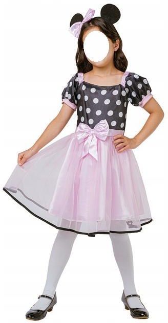 Ten uroczy strój nawiązuje do stylu ulubionej postaci z bajek i jest idealnym wyborem dla każdej dziewczynki, która chce wcielić się w rolę słodkiej bohaterki. Strój jest pełen wdzięku i elegancji, co sprawia, że doskonale sprawdzi się na różnego rodzaju bale przebierańców oraz tematyczne przyjęcia. W skład stroju wchodzą: Sukienka: Czarna sukienka w białe groszki, z krótkimi rękawami ozdobionymi różowymi wstawkami. Spódnica jest wykonana z jasnoróżowego tiulu, a całość jest przewiązana dużą, jasnoróżową kokardą w talii, co dodaje sukience uroku. Opaska: Czarna opaska z charakterystycznymi, okrągłymi uszami, ozdobiona różową kokardką, która dopełnia cały strój i nawiązuje do znanej postaci z kreskówek. Ten strój to świetny wybór na bal kostiumowy, zabawy tematyczne czy codzienne przebieranki.