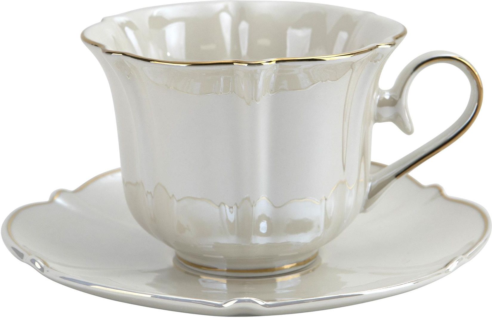 Porcelanowy zestaw filiżanek ze spodkami Leonardo. Kolekcja Leonardo wykonana jest z porcelany New Bone China renomowanej marki Veroni, charakteryzującej się elegancką perłową barwą z subtelnym połyskiem, a także wyjątkową wytrzymałością. Elegancka filiżanka z lekkimi wypukłościami została ozdobiona złotym paskiem. Spodek ze złota lamówką nadaje finezyjnego wyglądu. Podając kawę w takiej filiżance, zachwycisz gości takim podaniem. Zestaw zawiera: 2 x Filiżanka o pojemności producenta 240 ml 2 x Spodek o średnicy 15 cm Ozdobne pudełko Całość zapakowana jest w oryginalne, zdobione pudełko. Stanowi idealny pomysł na gotowy prezent zarówno dla kobiety jak i mężczyzny, a także podarunek dla szefa czy nauczyciela, również jako podziękowanie. Specyfikacja: Marka: Veroni Materiał: porcelana New Bone China Kolor: perłowy, złoty Zmywarka: Nie Mikrofala: Nie Wymiary filiżanki: 10× 12,5 × 7,5 cm Wymiary spodka: 15 × 2,2 cm