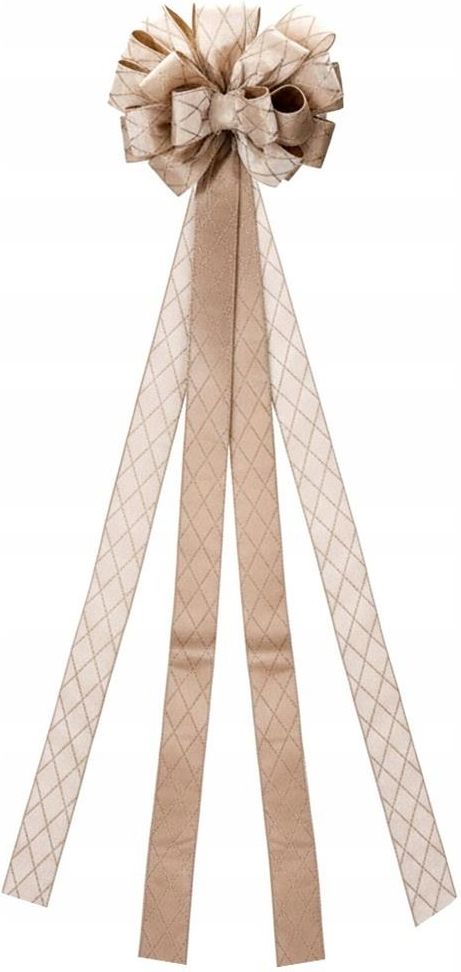 Kokarda dekoracyjna na choinkę beżowa 130x33 cm Duża kokarda na czubek choinki - Okazała kokarda dekoracyjna o wymiarach 130 x 33 cm, zaprojektowana specjalnie jako zwieńczenie choinki. Wykonana z materiału w beżowo złotym kolorze, ozdobiona brokatowym wzorem w romby, stanowi piękną i stylową …