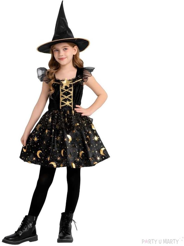 Kostium czarownicy na Halloween, strój wiedźmy na Andrzejki "Zestaw - sukienka i kapelusz", 120-130 Karnawał i Halloween to wyjątkowe okazje, które sprzyjają kreatywności i radości. Stroje karnawałowe odgrywają kluczową rolę w tych celebracjach, pozwalając na wcielenie się w różnorodne postacie i odkrywanie magii, która towarzyszy tym chwilom. Odkryjmy zatem niezwykły kostium czarownicy, który z pewnością dostarczy wielu atrakcyjnych możliwości na różnorodne wydarzenia. Opis kostiumu Kostium czarownicy na Halloween to klasyczny wybór, który nigdy nie wychodzi z mody. W skład zestawu wchodzi urocza sukienka oraz charakterystyczny kapelusz czarownicy. Sukienka ozdobiona jest pięknymi złotymi gwiazdkami i księżycami, które dodają całości niepowtarzalnego uroku. Kostium czarownicy idealnie sprawdzi się podczas Halloween, karnawału, Andrzejek, a także na szkolnych balach przebierańców. Dodatkowo, strój ten jest doskonałym wyborem do sesji zdjęciowych, które uchwycą magię tych niezwykłych chwil. Materiały i jakość wykonania Wybór materiałów jest kluczowy dla komfortu noszenia kostiumu czarownicy. Wykonany z wysokiej jakości poliesteru, ten kostium charakteryzuje się trwałością i łatwością w pielęgnacji. Poliester nie gniecie się, nie odkształca oraz nie wchłania wilgoci, co sprawia, że strój zachowa swój estetyczny wygląd nawet po długim czasie użytkowania. Dzięki tym właściwościom, kostium czarownicy będzie wygodny w noszeniu przez wiele godzin, co na pewno doceni każdy mały czarodziej. Rozmiary i dopasowanie Podczas wyboru kostiumu, ważne jest zwrócenie uwagi na dostępne rozmiary i dopasowanie. Kostium czarownicy jest dostępny w uniwersalnym rozmiarze, który pasuje do dzieci w przedziale wiekowym 7-8 lat. Aby zapewnić maksymalny komfort, warto zmierzyć obwód klatki piersiowej oraz długość sukienki. Odpowiednie dopasowanie jest istotne dla swobody ruchów oraz estetyki, co pozwala w pełni cieszyć się każdym momentem spędzonym w kostiumie. Dodatki i akcesoria Dodatki i akcesoria są nieodłącznym elementem każdej stylizacji, a w przypadku kostiumu czarownicy mogą w znacznym stopniu uzupełnić całość. Oto kilka propozycji, które warto rozważyć, aby wzbogacić swój strój: maska czarownicy, peruka w czarnym kolorze, biżuteria w stylu gotyckim, elementy dekoracyjne, np. sztuczne pająki, różne rodzaje kapeluszy czarownic, np. z innymi zdobieniami, miotła lub inny atrybut czarownicy. Dzięki tym dodatkom, kostium czarownicy stanie się jeszcze bardziej efektowny, a jego nosicielka z pewnością przyciągnie uwagę na każdej imprezie.