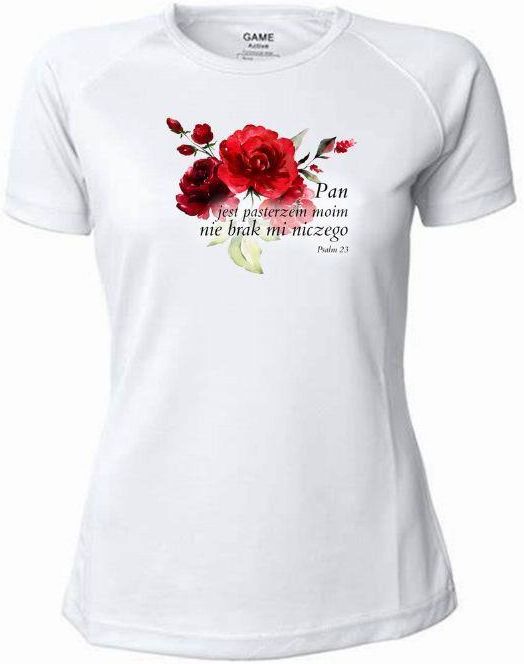 Koszulka w kolorze białym z napisem: Pan jest pasterzem moim, nie brak mi niczego. Ps 23 . Grafika: kwiaty. Gramatura materiału: 180g/m2. Skład: 100% bawełna, ściągacz przy szyi: bawełna z dodatkiem lycry. Metoda wykonania nadruku: sitodruk. Można prać w pralkach automatycznych zgodnie z instrukcją na metce.