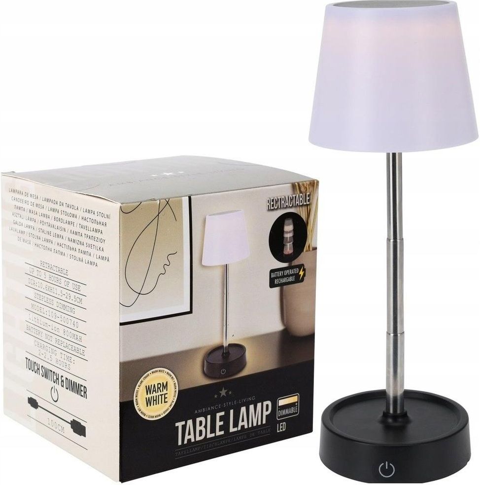 Lampa stołowa LED biała bezprzewodowa 11-29,5 cm Dotykowa lampa stołowa w kolorze białym. Lampka jest bezprzewodowa - ładowana za pomocą kabla USB-C. Posiada regulowaną wysokość od 11 do 29,5 cm oraz funkcję ściemniania. Kod id : 22491 Materiał : tworzywo Długość: 10,5 cm Szerokość: 10,5 cm Wysokość: 11-29,5 cm Waga (g): 173 Kolor dominujący: biały Lampka stołowa LED o regulowanej wysokości od 11 - 29,5 cm - Dekoracyjna lampa stołowa z regulowaną wysokością. Średnica klosza wynosi 10,5 cm. Lampka posiada 12 diod LED. Idealna do postawienia na biurku, komodzie, a nawet stole. Podstawa wykonana z tworzywa w czarnym kolorze, klosz wykonany z tworzywa w białym kolorze. Regulowany stelaż lampki wykonany z metalu w srebrnym kolorze. Posiada trzy filcowe podkładki. Regulacja intensywności światła - Dzięki funkcji ściemniania można wybrać idealną intensywność światła, zapewniając komfortowe oświetlenie zarówno do pracy, jak i do relaksu. Modny design - Lampa utrzymana jest w klasycznym stylu. Doskonale sprawdzi się jako oświetlenie sypialni, salonu, jadalni, czytelni, restauracji, a także w kuchni. Bardzo dobrze eksponuje światło. Dekoracja każdego wnętrza - Lampa zapewni niepowtarzalny klimat oraz przytulnie rozświetli pomieszczenie. Stanowi element dekoracyjny każdego wnętrza. Będzie pięknie prezentować się zarówno w klasycznych, jak i nowoczesnych wnętrzach. Bezprzewodowa ładowana za pomocą kabla USB-C - Lampka posiada akumulator litowo-jonowy 3,7V, który możemy ładować za pomocą kabla USB-C o długości 1 m. Lampka ma ciepłą, białą barwę. Lampka stołowa utrzymana w uniwersalnym stylu. Wykonana z solidnych materiałów. Lampka jest efektowna, dzięki czemu będzie idealnie komponować się z każdym wnętrzem. Świetnie sprawdzi się jako lampka do domu, biura, gabinetu i innych miejsc. Postawiona w salonie będzie tworzyć niepowtarzalny klimat. Świetnie sprawdzi się także jako lampka nocna postawiona w sypialni. Zapakowana w pudełko, stanowi oryginalny pomysł na prezent. Oryginalny produkt holenderskiej marki Ambiance. Wyprodukowano zgodnie z europejskimi standardami.
