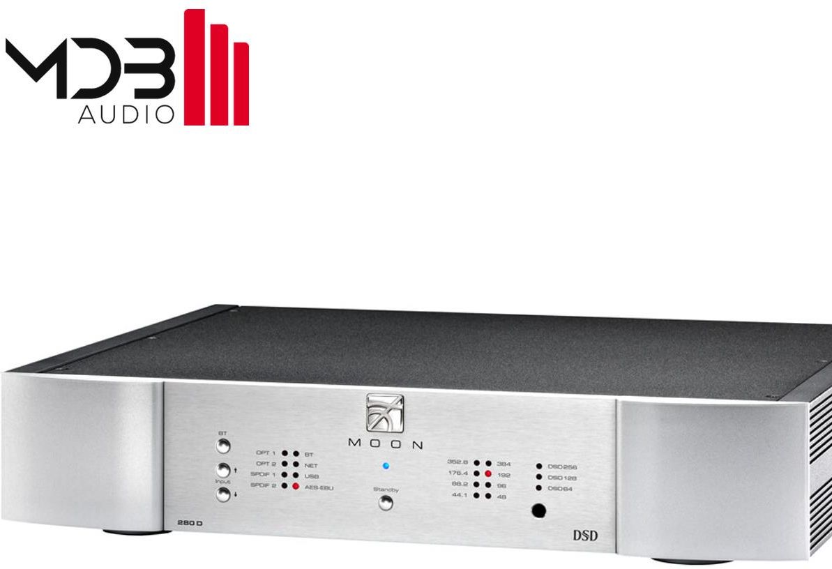 Moon 280D Przetwornik DAC Optional MiND 2 streaming module MiND 2 (MOON intelligent Network Device) is a fabulous way of streaming and listening to your music. MiND 2 is Roon Ready and allows the playback of all the most common file formats, including DSD, and MQA file formats (via local files and TIDAL Master files). World of music Imagine a world of music right at your fingertips. The MOON 280D makes this a reality. Simply launch your favorite music services app on your smart device and pair it to the MOON 280D using Bluetooth technology. Then sit back and enjoy the music. Lifelike transparency The extraordinary digital engine within the MOON 280D decodes native DSD up to DSD256, as well as PCM up to 32-bit/384kHz, including DXD. The fully balanced analog stage features an exceptional 3rd order filter for lifelike transparency. The result is a level of fidelity that creates an emotional connection to your music. Effortlessly for musical pleasure Which ever way you use the MOON 280D, we are convinced that it will become the center of your musical pleasure. Of course, key features you’d expect in a MOON product are present such as SimLink™, RS-232 and IR ports for custom-install environments. Design feature: Fully asynchronous DAC. Supports native DSD64, DSD128 and DSD256 (USB only). Supports PCM up to 384kHz (32-bit on USB only). 7 digital inputs (AES/EBU x 1, S/PDIF x 2, TosLink x 2, USB x 1 and Qualcomm® aptXTM audio for Bluetooth® x 1) for use with virtually any digital source. Front panel LED indicators for active input and input signal PCM sampling & DSD rates. Optional 8th digital input through our MiND 2 streaming module (via WiFi or Ethernet). Analog stage: fully balanced differential circuit for increased dynamic range and headroom, higher resolution, as well as improved signal-to-noise ratio. Dane techniczne: Frequency response (full range): 2 Hz - 100 kHz +0/-3 dB THD @ 1kHz, 0dBFS (A-weighted): 0.001 % Intermodulation distortion: 0.002 % Dynamic Range: 120 dB Signal-to-noise Ratio: 118 dB @ full output Channel Separation: 116 dB Intrinsic Jitter: 1 picosecond RMS Analog Output @ 0dBFS: 2.0 V Analog output impedance: 100 Ω PCM Bit-depth range: 16 - 32 bits PCM sampling frequency rates: 44.1 - 384 kHz DSD sample rates: DSD64, DSD128 & DSD256 Shipping weight: 7.5 kg Dimensions (width x height x depth): 42.9 x 8.6 x 33.3 cm