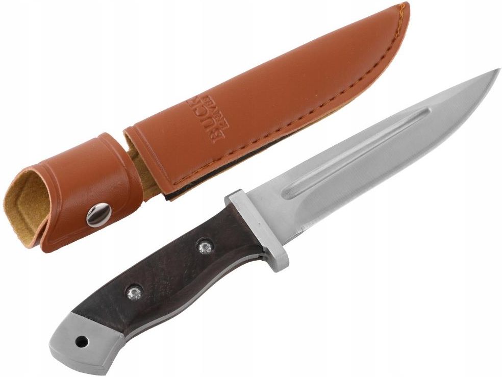 Nóż myśliwski + kabura Głownia typu Straight back dobrze nadaje się do cięcia i siekania. Nóż sprawdza się również podczas rąbania i pchnięć Cechy produktu: Nóż wykonany z wysokiej jakości stali Bardzo ostry Wygodnie leży w dłoni Nóż typu finka Konstrukcja z pełnym trzpieniem (full tang) Rękojeść z drewna mocowana na dwa piny Głowica z otworem na linkę Jelec chroni przed ześlizgnięciem się dłoni Bardzo solidne wykonanie Długość ostrza: 13 cm Długość noża: 25 cm W zestawie pokrowiec