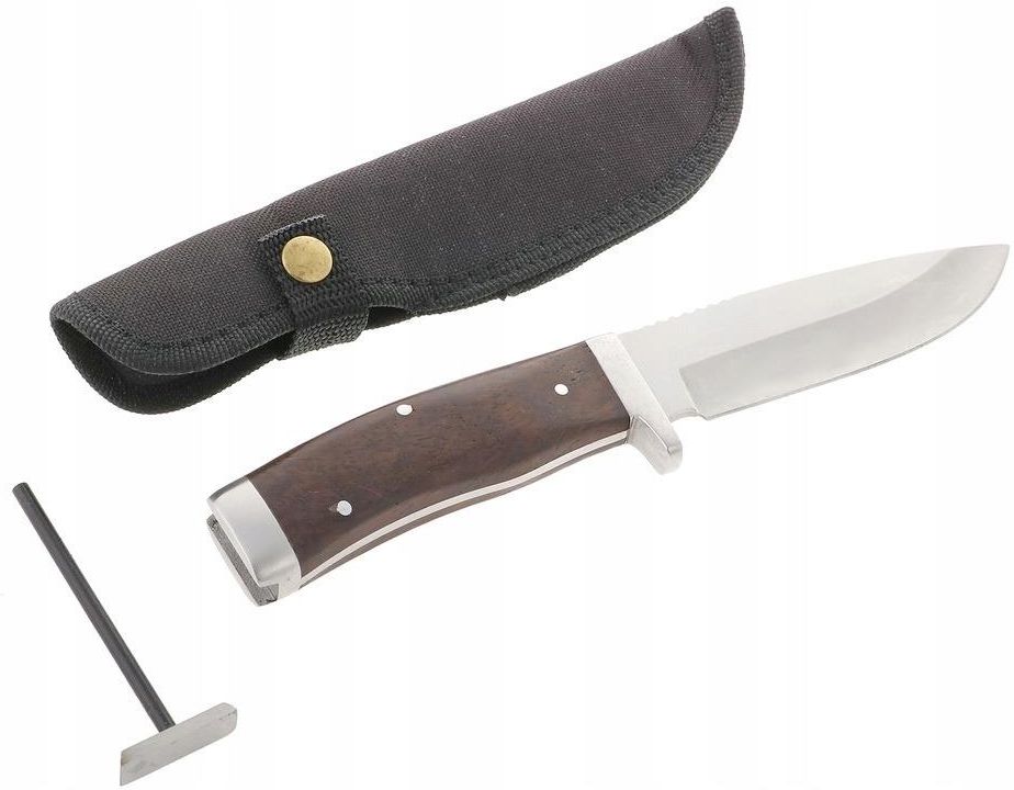 Nóż myśliwski z kaburą i krzesiwem Głownia typu Drop point utwardza sztych dzięki czemu nóż bardzo dobrze tnie. Idealny nóż myśliwski, ale również roboczy Cechy produktu: Idealny podczas survivalowych wypadów Nóż wykonany z wysokiej jakości stali Górna oraz dolna część ostrza wyposażona w ząbki Bardzo ostry Wygodnie leży w dłoni Grawer po jednej stronie głowni Rękojeść typu full tang (pełny trzpień) z drewnianych nakładek ze stalową głowicą Rękojeść montowana na 3 piny Bardzo solidne wykonanie Długość ostrza: 10,5 cm Długość noża: 22,5 cm W zestawie materiałowy pokrowiec oraz krzesiwo z możliwością schowania w uchwycie