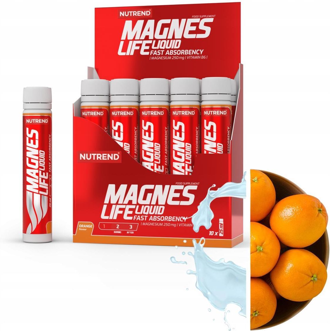 NUTREND MAGNESLIFE SHOT 10x25 ML POMARAŃCZA MagnesLife przeznaczenie: - dla sportowców oraz osób obciążonych dużym wysiłkiem fizycznym - zmniejsza napięcia nerwowo-mięśniowego, ułatwia regenerację i relaksację - uzupełnia niedobory po spożyciu alkoholu - zwiększa odporność na stres Nutrend MagnesLife to wysoce skuteczna forma magnezu przeciwdziałająca kurczom mięśni. Płynna postać zapewnia maksymalną szybkość działania, a zastosowana w preparacie forma organiczna jonów magnezu zapewnia najlepszą przyswajalność i wykorzystanie przez organizm. Charakterystyka substancji aktywnych MagnesLife: Magnez (magnesium) Mg jest jednym z najważniejszych mikroelementów dla organizmu. Ponieważ organizm sam go nie wytwarza, ważne jest przyjmowanie go z pożywieniem. Niedobory magnezu są przyczyną pobudliwości nerwowo-mięśniowej i kurczów mięśni. Magnez wpływa na prawidłowy rozwój układu kostnego, jest konieczny do prawidłowego metabolizmu wapnia, stymuluje mechanizmy obronne organizmu. Dodatek witaminy B6 ułatwia transport magnezu do wnętrza komórek. SKŁADNIKI Zawartość w porcji (25 ml): Magnez 250 mg 67% Witamina B6 8 mg 571% ZASTOSOWANIE Przeciwdziałanie kurczom mięśniowym i ich przezwyciężanie; uwalnianie napięcia nerwowo - mięśniowego; regeneracja i relaksacja; zapobieganie tężyczce; uzupełnianie niedoborów magnezu po spożyciu alkoholu; utrzymanie zdrowego serca i naczyń krwionośnych. ZALECANA DZIENNA PORCJA Podstawowa dawka – 1 fiolka MagnesLife (25 ml) dziennie, najlepiej przed snem. W trakcie przygotowania do długotrwałego wysiłku fizycznego stosować MagnesLife 2 - 3 dni przed wysiłkiem- przed snem. W trakcie długotrwałego wysiłku stosować MagnesLife przy pierwszych sygnałach zbliżającego się kurczu mięśnia. Maksymalna dawka 1 fiolka MagnesLife (25 ml) 1 x dziennie. Dawkowanie MagnesLife u dzieci powyżej 3 lat konsultować z lekarzem. Nie należy przekraczać dziennej dawki. Nie należy przekraczać zalecanej porcji do spożycia w ciągu dnia. Suplement diety nie może być stosowany jako substytut zróżnicowanej diety. Dla utrzymania prawidłowego stanu zdrowia należy stosować zróżnicowaną dietę i prowadzić zdrowy tryb życia. Produkt nie jest przeznaczony dla dzieci, kobiet w ciąży ani karmiących. Przechowywać w sposób niedostępny dla małych dzieci!
