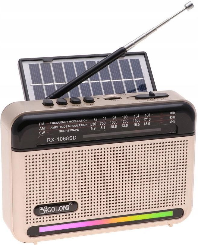 Radio przenośne z funkcją bluetooth i podświetleniem RGB Przydatne w każdym domu jak również w plenerze, może służyć również jako głośnik bluetooth. Cechy produktu: Włącznik z płynną regulacją głośności Podświetlenie RGB, kilka trybów świecenia, w tym w rytm muzyki Wbudowany panel solarny, który ładuje akumulator w słoneczne dni Tuner wbudowany w urządzenie umożliwia odbiór fal z pasm FM, AM oraz SW Regulator dostrojenia Wymienny akumulator 18650 (Gratis w zestawie) Funkcje odtwarzania: następna piosenka, poprzednia piosenka, play, pauza, przewijanie do przodu i do tyłu, TWS oraz zmiana trybu świecenia Funkcja Bluetooth - możliwość połączenia np. z telefonem Wejście na kartę TF Wejście USB 2.0, możliwość odtwarzania plików mp3 KabelUSB-C w zestawie Obrotowa antena teleskopowa Wymiary: 15 x 10,5 x 5,5 cm Zakresy radia: FM: 88 - 108 MHz AM: 530 - 1710 KHz SW: 5.9 - 18.0 MHz