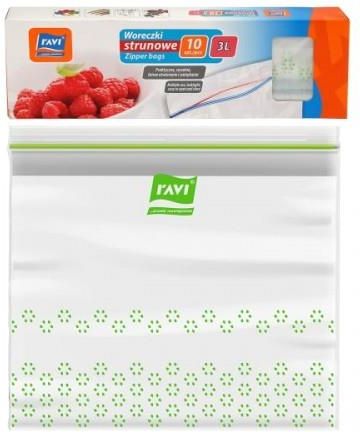 RAVI WORECZKI STRUNOWE 10 SZT.3L Woreczki strunowe 3lNowoczesne woreczki z zamknięciem strunowym, wykonane z odpornej na uszkodzenia folii LDPE, mają wszechstronne zastosowanie. Są doskonałe do zamrażania i przechowywania żywności, a także świetnie zabezpieczają dokumenty, kosmetyki, leki i …