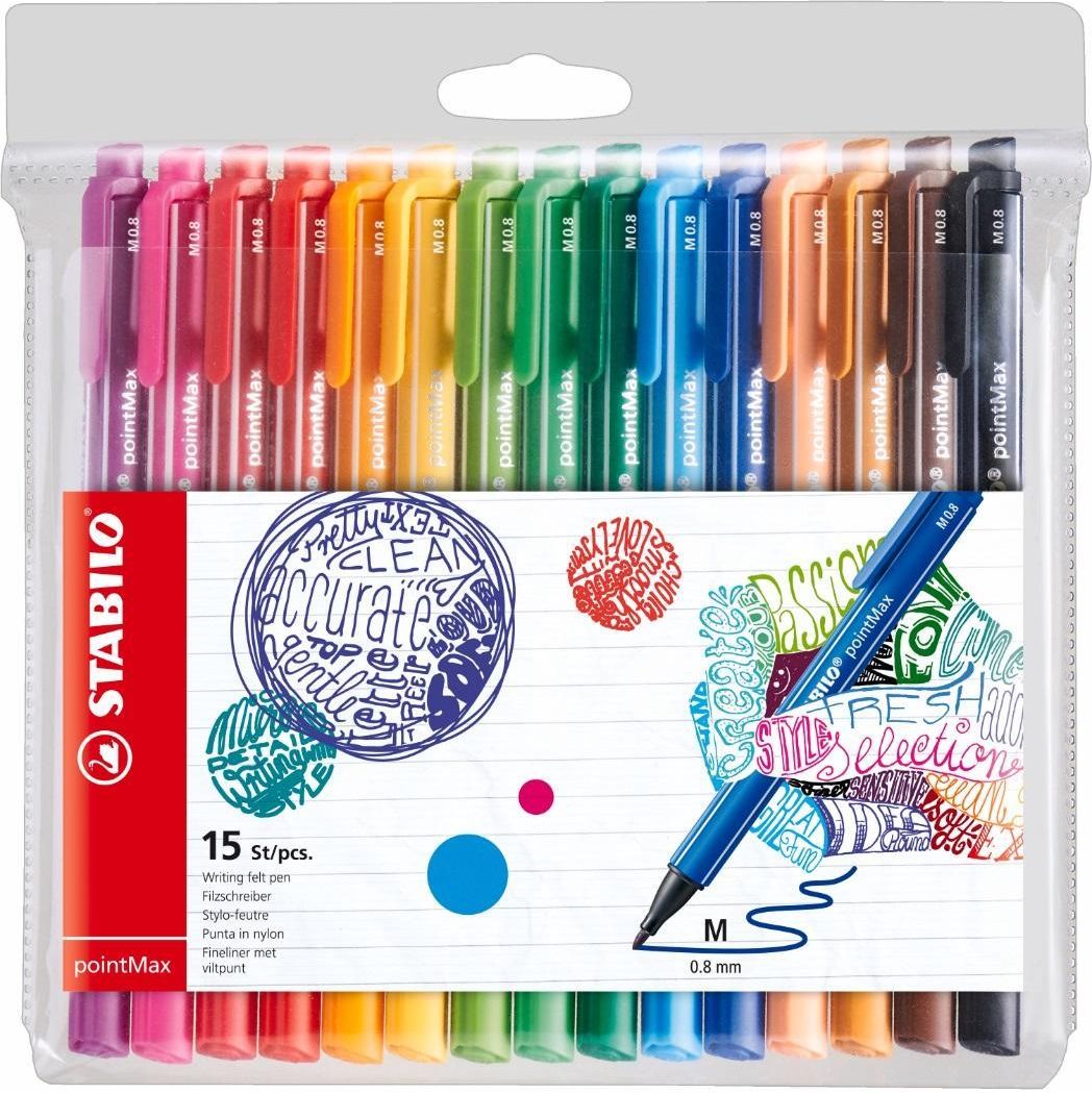 STABILO pointMax - nowa odsłona kultowego już cienkopisu STABILO. Cienkopis posiada obudowę w kolorze tuszu z charakterystycznymi dla STABILO jasnymi pasami, praktyczny klips i nylonową końcówka o grubości 0,8 mm idealną do pisania, rysowania, szkicowania i podkreślania. Stworzony z myślą o uczniach i studentach oraz tych którzy dużo piszą. Idealny do tworzenia map myśli i kolorowych notatek ułatwiających zapamiętywanie. Cienkopis dostępny jest w 24 intensywnych kolorach. Opakowanie to plastikowe etui zawierające 15 szt. w intensywnych kolorach.