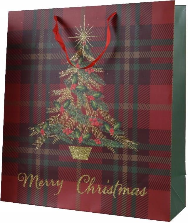 Świąteczna torba prezentowa 12x30x42cm Duża w kratkę z choinką Słomniki