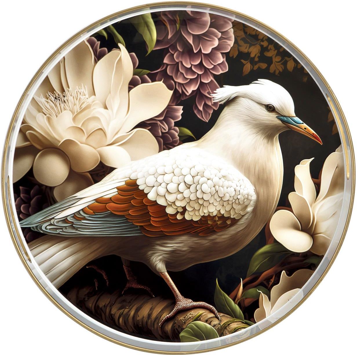 Piękna okrągła, taca dekoracyjna z tworzywa sztucznego. Perfekcyjnie zdobiona wzorem kolorowego ptaka na kwiatowym tle w artystycznym wydaniu. Wytworzona z dbałością o szczegóły. Niezwykle dostojna kompozycja, której uroku dodają charakterystyczne złote obrzeża. Taca udekoruje nie tylko stół, ale …