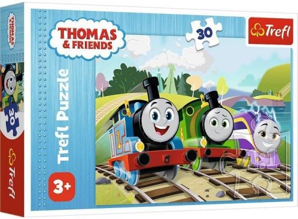 Trefl Puzzle 30el. Radosny Tomek 18294 Radosny Tomek to puzzle składające się z 30 elementów, zaprojektowane specjalnie z myślą o małych fanach bajki Tomek i przyjaciele. Po ułożeniu układanki powstanie obrazek o wymiarach 27 x 20 cm. Puzzle zostały wykonane z wysokiej jakości naturalnych materiałów, z zastosowaniem specjalnego, kalandrowanego papieru odbijającego światło, dzięki któremu układanie staje się jeszcze przyjemniejsze i łatwiejsze. Układanie puzzli niesie za sobą szereg korzyści, zarówni dla dzieci jak i dorosłych. To skuteczny sposób na ćwiczenie pamięci, koncentracji, a także niezawodny sposób na odstrsowanie się i odprężenie. Dzięki puzzlom trenujemy spostrzegawczość, ale również uczymy się cierpliwości. Ułożony przez nas, gotowy obraz możemy powiesić na ścianie, a tym samym urozmaicić wnętrze naszego mieszkania.
