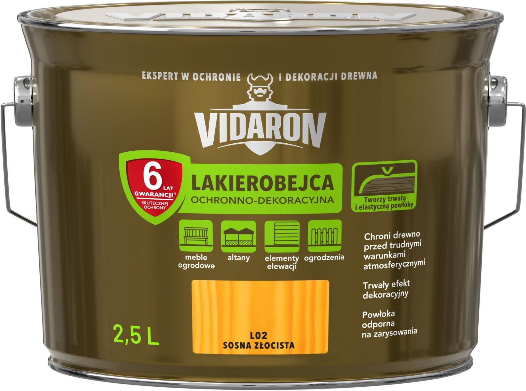 VIDARON Lakierobejca Ochronno-Dekoracyjna Pojemność: 2,5l | Kolor: L02 sosna złocista | Efekt wykończenia: połysk ZASTOSOWANIE Drewno Ogrodzenie Altana Meble Pergola Balustrada Meble wewnątrz pomieszczeń Drewniane elementy dekoracyjne Brama DOSTĘPNE KOLORY OPIS PRODUKTU Lakierobejca …