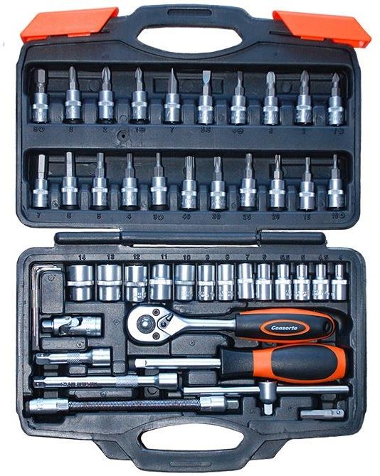 Funkcjonalny zestaw kluczy nasadkowych z grzechotką 1/4'' Wykonany z wysokogatunkowej stali narzędziowej CRV 50BV30. 46 szt. + walizka : 13 szt. Nasadki 1/4'': 4; 4.5; 5; 5.5; 6; 7; 8; 9; 10; 11; 12; 13; 14 mm 6 szt. Końcówki wkrętakowe TORX: T10; T15; T20; T25; T30; T40 6 szt. Końcówki wkrętakowe sześciokątne HEX: 3; 4; 5; 6; 7; 8 mm 3 szt. Końcówki wkrętakowe krzyżowe Philips: Ph1; Ph2; Ph3 3 szt. Końcówki wkrętakowe krzyżowe Pozidriv: Pz1; Pz2; Pz3 3 szt. Końcówki wkrętakowe płaskie: 4; 5.5; 7 mm 2 szt. Przedłużki 1/4'': 50; 100 mm 1 szt. Grzechotka 1/4'': 150 mm, 72T 1 szt. Pokrętło wkrętakowe 1/4'', 150 mm 1 szt. Pokrętło przesuwne 1/4'', 115 mm 1 szt. Przedłużka elastyczna 1/4'', 150 mm 1 szt. Przegub Cardana 1/4'' 1 szt. Adapter do końcówek 4 szt. Klucze imbusowe 1.27; 1.5; 2; 2.5