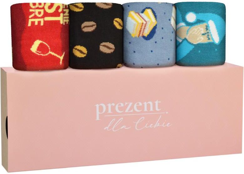 Kolorowy zestaw skarpetek Todo Socks, model: MOOD RELAX. Zestaw skarpet Mood Relax to 4 pary skarpet idealnych na leniwe dni, przepełnione tym, co tygryski lubią najbardziej. W zestawie skarpetki: Wino z napisem: Im starsze, tym lepsze, Śpioch - dla kochających długie drzemki, Kawa - na lepszy początek dnia, Książki - których nigdy za wiele. Zestaw zawiera 4 pary skarpetek Wino Śpioch Kawa Książki Wręcz ten zestaw prezentowy osobie, która jest dla Ciebie ważna. Z pewnością w tych skarpetkach poczuje ona 100% relaxu! Todo SOCKS, to polska marka produkująca kolorowe skarpety nie do pary. Nasze modele charakteryzuje najwyższa jakość oraz niebanalne wzornictwo. Zestaw zabawnych skarpetek, to idealny pomysł na prezent. Zestaw skarpetek Gift from the heart, to idealny wybór dla osób lubiących niebanalne upominki. Długie skarpety TODO zostały zaprojektowane i wykonane w Polsce z najwyższej jakości bawełny. Dobieraj skarpety do nastroju, zainteresowań, pory roku. Bojkotuj szarą rzeczywistość, przemierzając świat w kolorowych skarpetkach nie do pary. Nie bój się odmienności, to ona jest twórcą najlepszych pomysłów. TODO SOCKS to rewolucyjna marka, która łączy niepoprawnych optymistów. Skład wesołych skarpet TODO SOCKS: 80 % bawełna 17 % Poliamid 3 % Elastan Lewa i prawa skarpetka jest inna, tak jak na zdjęciu. Jak dbać o kolorowe skarpety, aby zachowały idealny kolor i trwałość? Pierz skarpety maksymalnie w 30 stopniach, Susz wesołe nie do pary w pozycji pionowej, Nie susz skarpet TODO SOCKS bębnowo Poświęć czas na relaks, nie prasuj kolorowych skarpet :) TODO SOCKS nie lubią wybielania