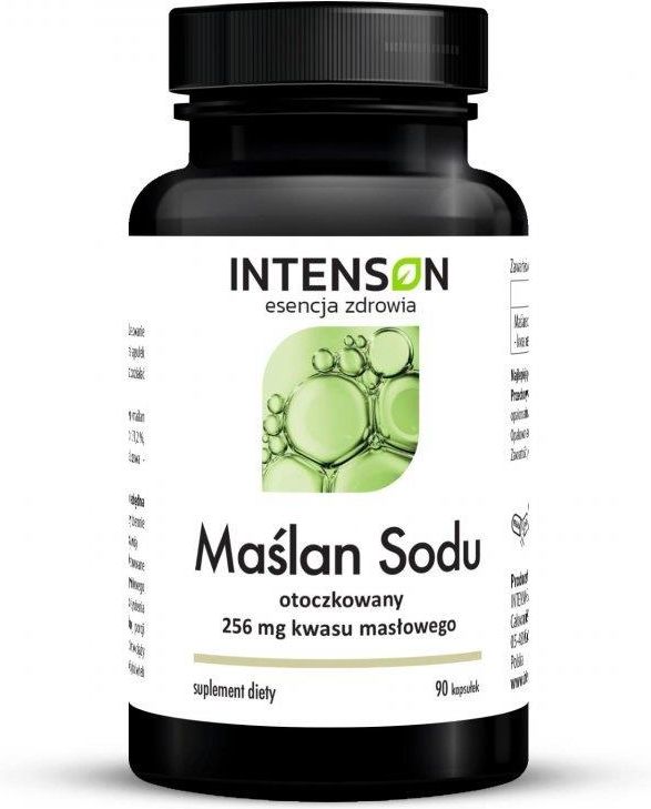 Intenson Maślan Sodu to zaawansowany suplement diety w formie kapsułek, stworzony z myślą o wsparciu zdrowia jelit i ogólnej kondycji układu pokarmowego. Każde opakowanie zawiera 90 kapsułek, co wystarcza na 45 dni regularnej suplementacji. Dla kogo? Produkt jest dedykowany osobom dorosłym, które: Borykają się z problemami jelitowymi, takimi jak SIBO, IBS czy inne zaburzenia trawienne. Chcą wspierać regenerację nabłonka jelitowego i utrzymanie zdrowej bariery jelitowej. Pragną poprawić komfort trawienia i ogólną kondycję układu pokarmowego. Składnik aktywny i jego działanie: Maślan sodu: Jest to sól sodowa kwasu masłowego, naturalnie występującego krótkołańcuchowego kwasu tłuszczowego. Maślan sodu odgrywa kluczową rolę w zdrowiu jelit, wspierając regenerację nabłonka jelitowego oraz utrzymanie prawidłowej flory bakteryjnej. Korzyści ze stosowania: Wsparcie zdrowia jelit: Maślan sodu wspomaga regenerację nabłonka jelitowego, co jest istotne dla utrzymania prawidłowej funkcji bariery jelitowej i zapobiegania problemom trawiennym. Redukcja stanów zapalnych: Dzięki właściwościom przeciwzapalnym, maślan sodu może łagodzić stany zapalne w jelitach, poprawiając komfort trawienia. Wsparcie przy SIBO i IBS: Suplementacja maślanem sodu może być pomocna w przypadku zespołu jelita drażliwego (IBS) oraz przerostu bakteryjnego jelita cienkiego (SIBO), wspierając zdrową florę jelitową i redukując objawy związane z tymi schorzeniami. Poprawa bariery jelitowej: Maślan sodu wspiera integralność bariery jelitowej, zapobiegając jej nadmiernej przepuszczalności, co jest ważne dla zapobiegania stanom zapalnym i dysbiozie. Wsparcie układu odpornościowego: Zdrowe jelita są kluczowe dla silnego układu odpornościowego, a maślan sodu wspiera ich prawidłowe funkcjonowanie, co przekłada się na lepsze zdrowie ogólne. Jak stosować? Zalecana porcja do spożycia w ciągu dnia niezbędna do uzyskania korzystnego efektu: 1 kapsułka 2 razy dziennie (rano i wieczorem), w trakcie posiłku, popijając dużą ilością wody. Dodatkowe informacje: suplementy diety nie mogą być stosowane jako zamienniki zróżnicowanej diety. Dla zachowania prawidłowego stanu zdrowia duże znaczenie ma zbilansowany sposób żywienia i zdrowy tryb życia. Nie należy przekraczać zalecanej porcji do spożycia w ciągu dnia. Nie należy stosować u dzieci, kobiet w ciąży i w trakcie laktacji lub w przypadku nadwrażliwości na którykolwiek ze składników produktu. Przechowywanie: przechowywać w suchym i chłodnym miejscu, w szczelnie zamkniętym opakowaniu, w sposób niedostępny dla małych dzieci. Skład: W 2 kapsułkach Maślan sodu - 720 mg, w tym: kwas masłowy (71,2%): 512 mg Składniki: otoczkowana sól sodowa kwasu masłowego (maślan sodu) standaryzowana na zawartość kwasu masłowego min. 71,2 %, składnik otoczki: skrobia modyfikowana; kapsułka celulozowa – hydroksypropylometyloceluloza.
