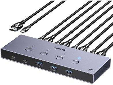 Przełącznik KVM (Keyboard Video Mouse, przełącznik klawiatury, obrazu i myszy) Ugreen AK701 to idealne rozwiązanie dla osób pracujących na kilku komputerach jednocześnie. Dzięki niemu możesz podłączyć aż 4 urządzenia do jednego monitora, klawiatury, myszy i innych akcesoriów USB (Universal Serial Bus, uniwersalne złącze do przesyłania danych i zasilania). Efekt? Porządek na biurku, oszczędność czasu i wygodne przełączanie się między systemami!