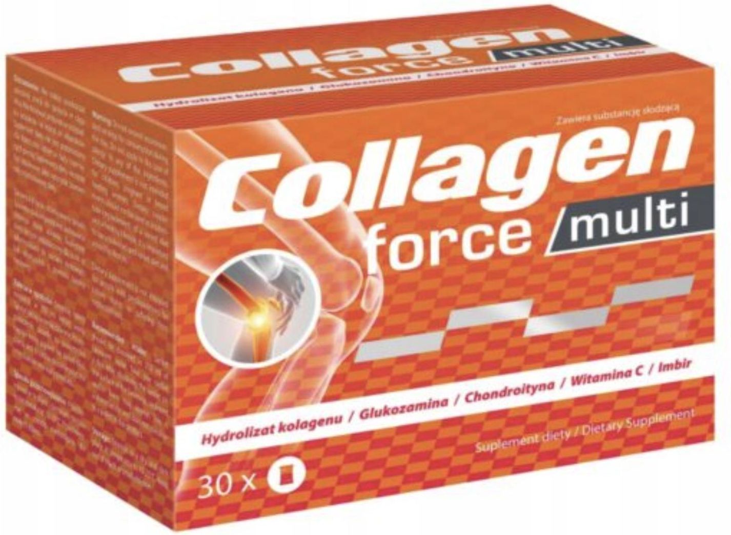 WEGAFARM Collagen Force Multi 30 sasz Cechy produktu Zawiera hydrolizat kolagenu wołowego i rybiego. Uzupełniony o siarczan glukozaminy, siarczan chondroityny oraz witaminę C. Kompleksowa formuła – wzbogacona o witaminy i minerały, które wspierają produkcję kolagenu. Poprawia elastyczność skóry i redukuje widoczność zmarszczek. Przyczynia się do zdrowego wzrostu i zwiększenia wytrzymałości włosów i paznokci. Pomaga w utrzymaniu prawidłowej ruchomości i wytrzymałości stawów. Wygodna forma saszetek. Naturalny smak. WEGAFARM Collagen Force Multi 30 sasz - opis WEGAFARM Collagen Force Multi to suplement diety opracowany z myślą o wsparciu zdrowia skóry, włosów, paznokci oraz stawów. Każda saszetka zawiera starannie dobraną mieszankę wysokiej jakości kolagenu oraz dodatkowe składniki aktywne, które wspierają regenerację tkanek i spowalniają procesy starzenia. Dzięki temu produktowi możesz cieszyć się jędrną i elastyczną skórą, a także zdrowymi, błyszczącymi włosami i mocnymi paznokciami. Suplement ten wyróżnia się kompleksową formułą, która nie tylko dostarcza organizmowi niezbędny kolagen, ale także wzbogacona jest o witaminy i minerały wspierające produkcję kolagenu oraz ochronę komórek przed stresem oksydacyjnym. Regularne stosowanie WEGAFARM Collagen Force Multi przyczynia się do poprawy elastyczności skóry, redukcji zmarszczek oraz ogólnej poprawy kondycji włosów i paznokci. Dodatkowo, preparat wspiera zdrowie stawów, pomagając utrzymać ich prawidłową ruchomość i wytrzymałość, co jest istotne dla osób aktywnych fizycznie. Dzięki wygodnej formie saszetek, suplement jest prosty w użyciu w różnych warunkach – wystarczy rozpuścić zawartość saszetki w wodzie lub ulubionym napoju i cieszyć się pełnymi korzyściami produktu. Dla kogo? WEGAFARM Collagen Force Multi to zaawansowany suplement diety w formie wygodnych saszetek, który wspiera regenerację skóry, włosów, paznokci oraz stawów dzięki wysokiej jakości kolagenowi i dodatkowym składnikom odżywczym. Regularne stosowanie poprawia elastyczność skóry, wzmacnia włosy i paznokcie oraz wspiera zdrowie stawów, oferując kompleksowe wsparcie dla Twojej urody i kondycji. Składniki aktywne: 1 saszetka (% RWS*) Hydrolizat kolagenu wołowego: 8000 mg Siarczan glukozaminy 2KCl: 1000 mg w tym glukozamina: 595,14 mg Hydrolizat kolagenu rybiego: 600 mg Witamina C: 450 mg (562,5%) Siarczan chondroityny: 200 mg w tym chondroityna: 152,61 mg Ekstrakt z kłącza imbiru Zingiber officinale Roscoe: 100 mg Składniki: hydrolizat kolagenu wołowego, siarczan glukozaminy 2KCl ze skorupiaków,hydrolizat kolagenu rybiego, kwas L-askorbinowy ( witamina C), regulator kwasowości ( kwas cytrynowy), sól sodowa siarczanu chondroityny, ekstrakt z kłącza imbiru Zingiber officinale Roscoe, aromat wiśniowy, substancja przeciwzbrylająca: (dwutlenek krzemu), koncentrat buraka czerwonego, aromat pomarańczowy, substancja słodząca (sukraloza), barwnik ( ryboflawina). Opakowanie: 30 sasz. Porcja: 1. Liczba porcji w opakowaniu: 30. Sposób użycia Saszetkę należy rozpuścić w 250 ml letniej wody. Spożyć jedną saszetkę dziennie. Po rozpuszczeniu saszetki na powierzchni napoju może pojawić się obsad i/lub piana. Jest to cecha charakterystyczna i nie stanowi ona wady produktu. Przeciwwskazania Nie zaleca się stosowania przez kobiety w ciąży, matki karmiące piersią, dzieci, a także osoby uczulone na któryś ze składników produktu. Suplement diety nie może być substytutem (zamiennikiem) zdrowego trybu życia. Nie przekraczać zalecanej dziennej dawki! Przechowywanie Przechowywać w suchym i ciemnym miejscu niedostępnym dla małych dzieci. Podmiot odpowiedzialny: WegaFarm Plucinścy sp. k., NIP 8571927266, ul. Niekładzka 9, 72-300 Gryfice. DO KAŻDEGO ZAMÓWIENIA OTRZYMUJESZ GRATIS! SM MAGAZYN - VIDEOBOOK DLA MIŁOŚNIKÓW SPORTU Wywiady z ikonami sportu Treningi z najlepszymi w swojej dziedzinie Diety Poradniki Ciekawostki Robiąc zakupy otrzymujesz nielimitowany dostęp do darmowej prenumeraty SM Magazyn, który wysyłamy do Ciebie w formie elektronicznej po opłaceniu zamówienia. Każdy numer to ponad 80 stron! Otrzymujesz także dostęp do pełnego archiwum! Jesteśmy autorem oraz wydawcą videobooka SM Magazyn. Dzieło zarejestrowane pod ISBN: 978-83-955667-1-4