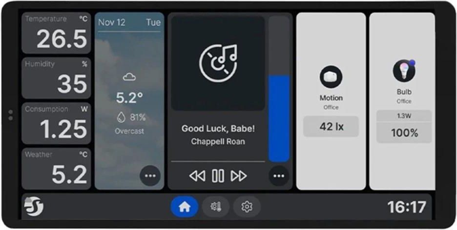 Shelly – inteligentny panel ścienny z ekranem dotykowym i czujnikiem temperatury i wilgotności Shelly Wall Display X2 z czujnikiem BLU H&T to inteligentny zestaw do nowoczesnego domu, łączący w sobie funkcje sterowania, monitoringu klimatu i automatyzacji.W jego skład wchodzi srebrny panel ścienny z 6,9-calowym ekranem dotykowym oraz biały czujnik temperatury i wilgotności Bluetooth, które razem tworzą kompletny system kontroli komfortu i energii. Panel Shelly Wall Display X2 został zaprojektowany jako inteligentne zastępstwo tradycyjnego włącznika ściennego.Dzięki zintegrowanemu przekaźnikowi 5 A może bezpośrednio sterować oświetleniem, gniazdami lub urządzeniami grzewczymi i klimatyzacyjnymi.Duży, kolorowy ekran o przekątnej 6,95” oferuje intuicyjną obsługę, możliwość personalizacji ekranu głównego oraz wybór orientacji – pionowej lub poziomej. Wbudowane czujniki temperatury, wilgotności i natężenia światła umożliwiają tworzenie automatyzacji reagujących na zmieniające się warunki w pomieszczeniu, a współpraca z czujnikiem BLU H&T pozwala wykorzystać panel jako termostat z precyzyjnym sterowaniem ogrzewaniem lub wentylacją. Urządzenie działa w oparciu o system Android 8.1, komunikuje się przez Wi-Fi i Bluetooth, może pracować samodzielnie bez huba lub pełnić funkcję bramki Bluetooth dla innych urządzeń Shelly. Wszystkie funkcje dostępne są z poziomu aplikacji Shelly Smart Control (Android / iOS / Web). To eleganczne i wszechstronne rozwiązanie, które łączy komfort obsługi, inteligentne sterowanie i oszczędność energii – w jednym, stylowym zestawie Shelly. Najważniejsze informacje Aplikacja Shelly Smart Control (Android / iOS / Web) – zdalne sterowanie, sceny, harmonogramy i monitorowanie urządzeń. Kolorowy ekran dotykowy 6,9” (17,6 cm) – personalizowany interfejs, widżety, tryb pionowy lub poziomy. Zintegrowany przekaźnik 5 A (230 V AC) – bezpośrednie sterowanie oświetleniem, gniazdami lub urządzeniami grzewczymi. Wbudowane czujniki temperatury, wilgotności i natężenia światła – automatyzacja w zależności od warunków w pomieszczeniu. Czujnik BLU H&T w zestawie – dokładny pomiar temperatury i wilgotności, komunikacja Bluetooth. Funkcja termostatu – automatyczne sterowanie ogrzewaniem i wentylacją na podstawie pomiarów z czujnika. Łączność Wi-Fi 2.4 GHz i Bluetooth 5.0 – stabilne połączenie i szybka konfiguracja bez huba. Bramka Bluetooth (BLE Gateway) – przekazywanie sygnałów z innych urządzeń Shelly BLU do sieci Wi-Fi. System Android 8.1 – szybka praca, aktualizacje OTA, integracje z Home Assistant, Alexa, Google Home i SmartThings. Procesor SC7731E (Quad-Core 1.3 GHz), RAM 1 GB, Flash 4 GB – wysoka wydajność i płynna obsługa. Wbudowany głośnik 0,8 W – dźwięki powiadomień, alarmy i komunikaty systemowe. Jedno wejście sterujące (SW) – możliwość podłączenia przycisku lub przełącznika ściennego. Obsługiwane obciążenia – rezystancyjne, indukcyjne i pojemnościowe (z RC Snubber). Dodatkowe czujniki – mikrofon, czujnik zbliżeniowy i G-sensor. Zasięg komunikacji – Wi-Fi do 30 m wewnątrz / 50 m na zewnątrz, Bluetooth do 10 m wewnątrz. Zasilanie 230 V AC lub USB-C 5 V/1 A – niskie zużycie energii (< 1 W). Bezpieczeństwo – ochrona przed przegrzaniem, stabilna praca w zakresie –20 °C do +40 °C. Monitorowanie energii w pomieszczeniu – analiza zużycia w aplikacji Shelly Smart Control. Tryb oszczędzania energii – automatyczne wygaszanie ekranu po braku aktywności. Materiały i kolor – srebrny panel z aluminium, szkła i tworzywa; biały czujnik BLU H&T. Montaż w puszce Ø60 mm – łatwa instalacja zamiast tradycyjnego włącznika. Wymiary czujnika Shelly BLU H&T: 38 × 38 × 10 mm, zasilanie baterią CR2032 (w zestawie). Wymiary i wygląd Shelly Wall Display X2 to nowoczesny panel ścienny o eleganckim, aluminiowo-szklanym wykończeniu w kolorze srebrnym.Urządzenie jest smukłe i estetyczne, dlatego dobrze komponuje się z nowoczesnymi wnętrzami. Wymiary z zasilaczem: 86 × 173 × 33 mm Wymiary bez zasilacza: 86 × 173 × 10,5 mm Kolor: srebrny W zestawie znajduje się czujnik temperatury i wilgotności Shelly BLU H&T w kolorze białym.To kompaktowe, bezprzewodowe urządzenie, które komunikuje się z panelem przez Bluetooth. Wymiary czujnika: 38 × 38 × 10 mm Zasilanie: bateria CR2032 (w zestawie) Montaż i schemat podłączenia Shelly Wall Display X2 jest przystosowany do montażu w standardowej puszce instalacyjnej Ø60 mm, dzięki czemu może zastąpić tradycyjny włącznik ścienny.Podczas instalacji należy pamiętać, że puszka znajduje się po lewej stronie panelu, a ekran wystaje w prawo o ok. 102 mm.Od krawędzi puszki do początku obudowy pozostaje ok. 16 mm – pozwala to na estetyczne dopasowanie panelu do ściany. Podłączenie przewodów Z tyłu urządzenia znajdują się cztery zaciski śrubowe: L – przewód fazowy (230 V AC) N – przewód neutralny O – wyjście przekaźnika (np. oświetlenie, wentylator, gniazdo) SW – wejście przycisku sterującego Panel wymaga zasilania 230 V AC oraz obecności przewodu neutralnego (N).Zintegrowany przekaźnik umożliwia bezpośrednie sterowanie obciążeniem do 5 A. Instrukcja montażu Odłącz zasilanie 230 V. Podłącz przewody zasilające do zacisków L i N, a obciążenie do O. Jeśli chcesz dodać lokalne sterowanie, podłącz przycisk do wejścia SW. Włóż moduł do puszki i przykręć go do ściany. Wsuń panel w uchwyt montażowy i dociśnij, aż zatrzaśnie się w prowadnicach. Włącz zasilanie – ekran uruchomi się automatycznie. Dodaj urządzenie w aplikacji Shelly Smart Control i połącz z siecią Wi-Fi. Dzięki oddzielnemu uchwytowi montażowemu panel można łatwo zdemontować bez odpinania przewodów, co ułatwia serwis lub aktualizację oprogramowania. Zdalne sterowanie i funkcje ekranu Shelly Wall Display X2 to centralny panel st