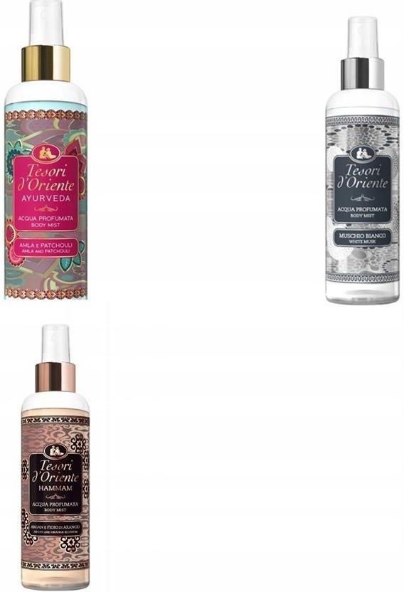 Tesori d’Oriente mgiełka do ciała zestaw 3 zapachów: Muschio Bianco Ayurveda Hammam 3 x 200 ml Tesori d’Oriente Muschio Bianco to elegancka mgiełka do ciała o subtelnym, delikatnym zapachu białego piżma. Lekka formuła odświeża skórę i otula ją delikatną wonią, która dodaje klasy i harmonii na cały dzień. Idealna do codziennego użytku – zarówno po kąpieli, jak i w ciągu dnia dla szybkiego odświeżenia. Pojemność: 200 ml Rodzaj: mgiełka do ciała (body mist) Nuty zapachowe: białe piżmo, nuty pudrowe i kwiatowe Działanie: odświeżające, relaksujące, perfumujące Stosowanie: bezpośrednio na skórę lub włosy Efekt: subtelny, elegancki zapach, który utrzymuje się przez wiele godzin Tesori d’Oriente Muschio Bianco to mgiełka dla osób ceniących klasyczne, czyste kompozycje zapachowe. Nadaje się na każdą okazję i porę roku, otulając skórę zmysłową aurą świeżości i delikatności. Tesori d’Oriente Ayurveda to odświeżająca mgiełka do ciała inspirowana tradycyjną indyjską filozofią harmonii i równowagi. Łączy w sobie orientalne nuty zapachowe, które pobudzają zmysły i wprowadzają w stan relaksu. Lekka formuła sprawia, że mgiełka doskonale odświeża skórę w ciągu dnia, nie pozostawiając tłustej warstwy. Idealna na lato lub jako delikatna alternatywa dla perfum. Pojemność: 200 ml Rodzaj: mgiełka do ciała (body mist) Nuty zapachowe: orientalne, korzenne, inspirowane ajurwedą Działanie: odświeżające i relaksujące Stosowanie: do codziennego użytku na ciało i włosy Efekt: lekki, długo utrzymujący się zapach bez obciążania skóry Dlaczego warto: Tesori d’Oriente Ayurveda to idealna propozycja dla osób poszukujących naturalnej równowagi i odrobiny egzotyki na co dzień. Subtelny zapach i wygodna forma sprayu sprawiają, że możesz cieszyć się chwilą odprężenia zawsze, gdy tego potrzebujesz. Tesori d’Oriente Hammam to orientalna mgiełka do ciała inspirowana rytuałami hammam, które od wieków służą oczyszczeniu ciała i umysłu. Kompozycja zapachowa oparta na olejku arganowym i kwiatach pomarańczy otula skórę ciepłym, zmysłowym aromatem. Mgiełka idealnie sprawdzi się do codziennego odświeżania, nie obciążając skóry i zapewniając długotrwałe uczucie komfortu. Pojemność: 200 ml Rodzaj: mgiełka do ciała (body mist) Nuty zapachowe: olejek arganowy, kwiat pomarańczy, orientalne akordy Działanie: odświeżające, relaksujące, nadające zapach Stosowanie: do ciała i włosów, idealna na każdą porę dnia Efekt: subtelny, długotrwały zapach bez tłustego filmu Mgiełka Tesori d’Oriente Hammam to wyjątkowy sposób na codzienny luksus i chwilę odprężenia. Jej orientalna woń przeniesie Cię w świat bliskowschodnich rytuałów pielęgnacyjnych, podkreślając Twoją wyjątkowość.