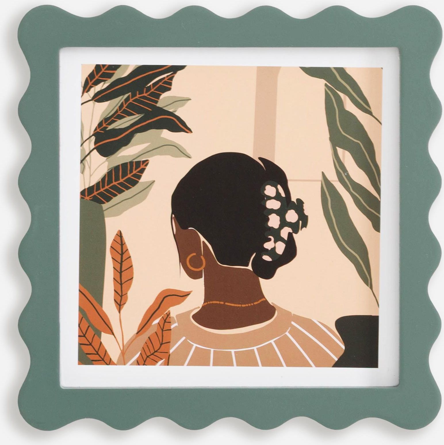 Delikatna scena ukazana z tyłu - kobieta z spinką we włosach, otoczona liśćmi w ciepłej palecie beżu i zieleni. Ujęcie budzi spokój i tworzy subtelny moment wyciszenia. Całość otoczona jest ozdobną, falistą ramką w kolorze zielonym, co nadaje pracy delikatny, nieco retro lub vintage klimat. Styl ten dobrze pasuje do wnętrz w duchu boho, naturalnym lub klasycznym. Format 20 × 20 cm - idealny do małych przestrzeni. Detal florystyczny - przywołuje naturalne skojarzenia Sprawdzi się w sypialni, przedpokoju lub domowej galerii