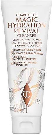 Charlotte's Magic Hydration Revival Cleanser to NOWOŚĆ. To formuła oczyszczająca 3 w 1 wzbogacona w silne składniki, takie jak kwas hialuronowy i peptydy, które nadają skórze świeży i promienny wygląd. Kremowa konsystencja zmienia się w piankę, a potem mleczną emulsję, która jednym gestem oczyszcza, nawilża, rewitalizuje i przygotowuje skórę. Skóra jest od razu zrewitalizowana, a efekty działania zostały potwierdzone klinicznie. W składzie: – Nawilżający kwas hialuronowy: dogłębnie nawilża i pozostawia skórę wyraźnie gładszą i wypełnioną. – Wygładzający kompleks peptydowy: wyrównuje pory i powierzchnię skóry. – Biomimetyczna technologia ochronna na bazie lipidów: wzmacnia barierę skóry i poprawia nawilżenie. Efekty: Skóra jest natychmiast 2 razy lepiej nawilżona, a efekt utrzymuje się do 24 godzin (1) Po 7 dniach skóra jest rozświetlona i promienna (1) Po 14 dniach pory są 4 razy mniej widoczne (2) Po 7 dniach skóra jest piękniejsza i gładsza w 97% (3) (1) Testowany w grupie 33 osób (2) Testowany w grupie 33 osób po 2 tygodniach (3) Testowany w grupie 33 osób po 1 tygodniu Warto wiedzieć: formuła nietestowana na zwierzętach
