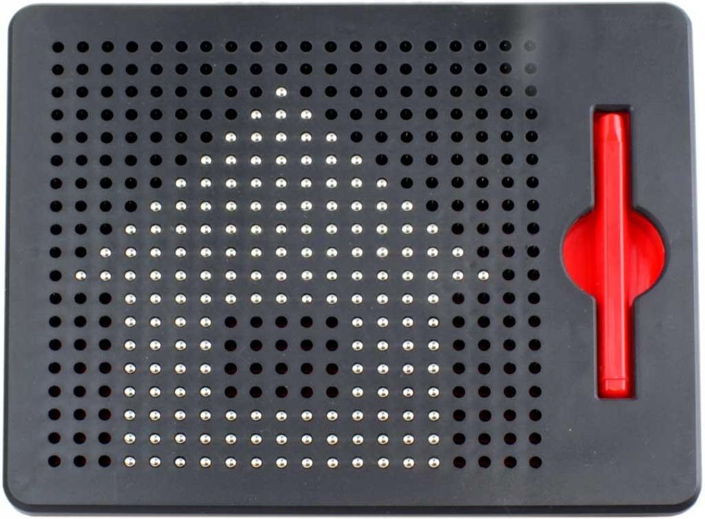 Zabawa polega na rysowaniu załączonym rysikiem z magnesem przy dotknięciu rysika do talicy wysuwają się kuleczki - powstają napisy lub obrazki. W zestawie szablony i rysik. Wymiary opakowania: 21x18x2cm Wiek: 3+ Produkt występuje w dwóch wariantach kolorystycznych (czerwony i czary) wysyłanych losowo.