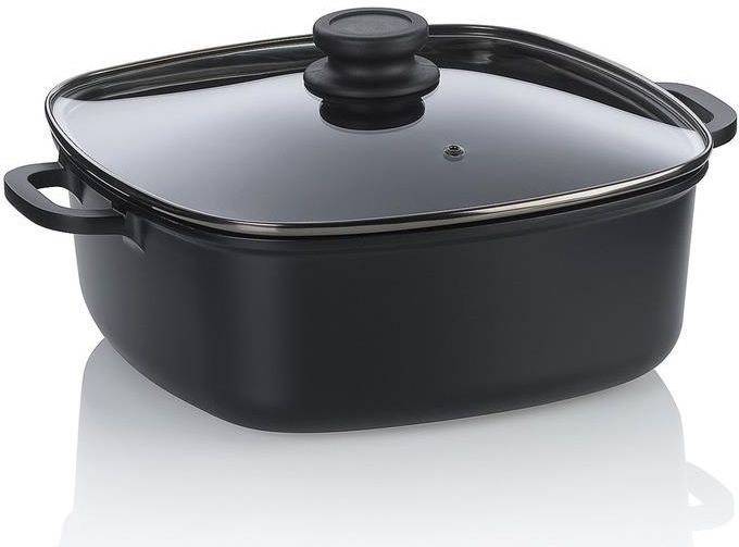 Naczynie do zapiekania, KELA Atura, kwadratowe 6 l z pokrywką szklaną to praktyczne i wszechstronne naczynie do przygotowywania zapiekanek, mięs, warzyw i dań jednogarnkowych. Produkt przeznaczony jest do pieczenia i podawania potraw, zapewniając równomierne pieczenie oraz łatwe serwowanie. Naczynie do zapiekania, KELA Atura, kwadratowe 6 l z pokrywką szklaną wyróżnia się nieprzywieralną powłoką oraz solidnym wykonaniem, co ułatwia przyrządzanie potraw i utrzymanie czystości. Zawartość zestawu Naczynie w komplecie ze szklaną pokrywką. Pojemność: 6 l. Charakterystyki produktu Wymiary: 28 x 28 x 11 cm (dł. x szer. x wys.) Materiał korpusu: aluminium Pokrywka: szkło Elementy pomocnicze: tworzywo sztuczne (uchwyty) Powłoka: nieprzywieralna powłoka KelaTan CS5, nie zawiera PFAS ani PTFE Kompatybilność: odpowiednie na wszystkie typy kuchenek Pojemność: 6 litrów Kolor: czarny Kolekcja: Atura Pielęgnacja: myć ręcznie Przyjemności produktu - równomierne rozprowadzanie ciepła dzięki aluminiowej konstrukcji - nieprzywieralna powłoka KelaTan CS5 ułatwiająca czyszczenie - brak PFAS i PTFE dla większego bezpieczeństwa użytkowania - uniwersalna kompatybilność z różnymi typami kuchenek - szklana pokrywka pozwalająca kontrolować proces pieczenia bez podnoszenia - ergonomiczne uchwyty z tworzywa zwiększające komfort przenoszenia - duża pojemność 6 l do przygotowywania rodzinnych porcji - trwałe materiały zapewniające długą żywotność produktu - oszczędność energii dzięki efektywnemu przewodzeniu ciepła - higieniczna powierzchnia ułatwiająca utrzymanie czystości - bezpieczeństwo użytkowania przy zachowaniu zasad obsługi - łatwość serwowania bezpośrednio z naczynia - estetyczny, uniwersalny design pasujący do wielu kuchni - odporność na codzienne użytkowanie przy właściwej pielęgnacji - wygoda przechowywania dzięki kompaktowym wymiarom Rozszerzony opis Naczynie zaprojektowano z myślą o codziennym użytkowaniu: aluminiowy korpus zapewnia szybkie i równomierne nagrzewanie, a nieprzywieralna powłoka KelaTan CS5 minimalizuje przywieranie potraw oraz ułatwia mycie. Szklana pokrywka pozwala obserwować proces pieczenia bez utraty ciepła, co zwiększa efektywność przygotowywania potraw. Produkt przewyższa wiele konkurencyjnych naczyń dzięki połączeniu lekkości aluminium z praktycznością pokrywki szklanej oraz bezpiecznej powłoki pozbawionej PFAS i PTFE. Ergonomiczne uchwyty z tworzywa zwiększają wygodę użytkowania, a uniwersalna kompatybilność gwarantuje zastosowanie na różnych typach kuchenek. Przy właściwej konserwacji naczynie zachowuje właściwości użytkowe przez długie lata, co przekłada się na oszczędność i satysfakcję z użytkowania. Dodatkowe informacje Kraj pochodzenia: (informacja według danych producenta) Pielęgnacja i czyszczenie: myć ręcznie; unikać metalowych narzędzi; przed pierwszym użyciem dokładnie umyć naczynie; używać rękawic ochronnych ze względu na ryzyko poparzenia; nie zostawiać gorącego naczynia bez nadzoru i w zasięgu dzieci Opakowanie: opakowanie detaliczne producenta Design: czarny, zaokrąglony kwadrat, kolekcja Atura Certyfikaty i bezpieczeństwo: powłoka bez PFAS i PTFE; spełnia standardy bezpieczeństwa żywnościowego zastosowane przez producenta