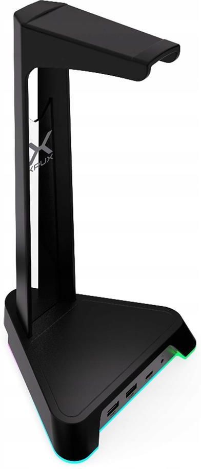 Podstawka pod słuchawki KRUX Rivt Krux Rivt to nowoczesny stojak na słuchawki, stworzony z myślą o graczach, streamerach oraz miłośnikach muzyki, którzy potrzebują czegoś więcej niż tylko zwykłego uchwytu na headset. Dzięki podświetleniu RGB, wbudowanemu hubowi USB oraz zintegrowanemu adapterowi audio zapewnia komfort, funkcjonalność i przyciągający uwagę akcent na Twoim stanowisku. Praktyczny hub USB Z Krux Rivt masz zawsze łatwy dostęp do dodatkowych gniazd USB. Stojak wyposażono w dwa porty USB-A oraz jeden port USB-C. Idealnie nadają się do podłączenia pamięci USB, czytnika kart, odbiorników od myszy, klawiatury, słuchawek, gamepadów oraz innych urządzeń peryferyjnych. Dzięki temu masz pod ręką to, czego akurat najbardziej potrzebujesz. Efektowne podświetlenie RGB Podświetlenie RGB jest zlokalizowane wzdłuż całej podstawy, tworząc na przezroczystej plexi atrakcyjną poświatę. Możesz idealnie dopasować efekt do nastroju lub stylu stanowiska. Do wyboru masz mix kolorów, pulsujące światło, spokojne przejścia tonalne czy jednolitą barwę i jasność. Dotykowy przycisk sterowania RGB Zmiana trybów podświetlenia jest niezwykle łatwa i wygodna dzięki zintegrowanemu przyciskowi dotykowemu. Za jego pomocą przełączysz się pomiędzy różnymi efektami iluminacji RGB lub wyłączysz LED jednym dotknięciem i bez konieczności instalowania dodatkowego oprogramowania. Port audio minijack 3,5 mm Krux Rivt pełni również funkcję adaptera audio. Wbudowane gniazdo minijack 3,5 mm pozwala na bezpośrednie podłączenie słuchawek, co jest szczególnie przydatne, gdy headset dysponuje krótkim przewodem. Słuchanie muzyki lub granie z Krux Rivt staje się jeszcze bardziej komfortowe. KRUX Rivt – specyfikacja techniczna Rodzaj produktu: stojak na słuchawki Kolor: czarny Wymiary (wys.×szer.×gł.): 136×160×285 mm Waga: 278 g Złącze zasilania: USB-C Dodatkowe złącza USB: 2× USB-A, 1×USB-C Złącze audio: minijack 3,5 mm Napięcie wejściowe: 5V 1,0A Podświetlenie: RGB LED Długość przewodu: 2 m Kompatybilne typy urządzeń: PC / Laptopy Kompatybilne systemy operacyjne: Windows / MacOS Zestaw zawiera 1× Stojak na słuchawki Krux Rivt 1× Przewód USB 1× Instrukcja obsługi