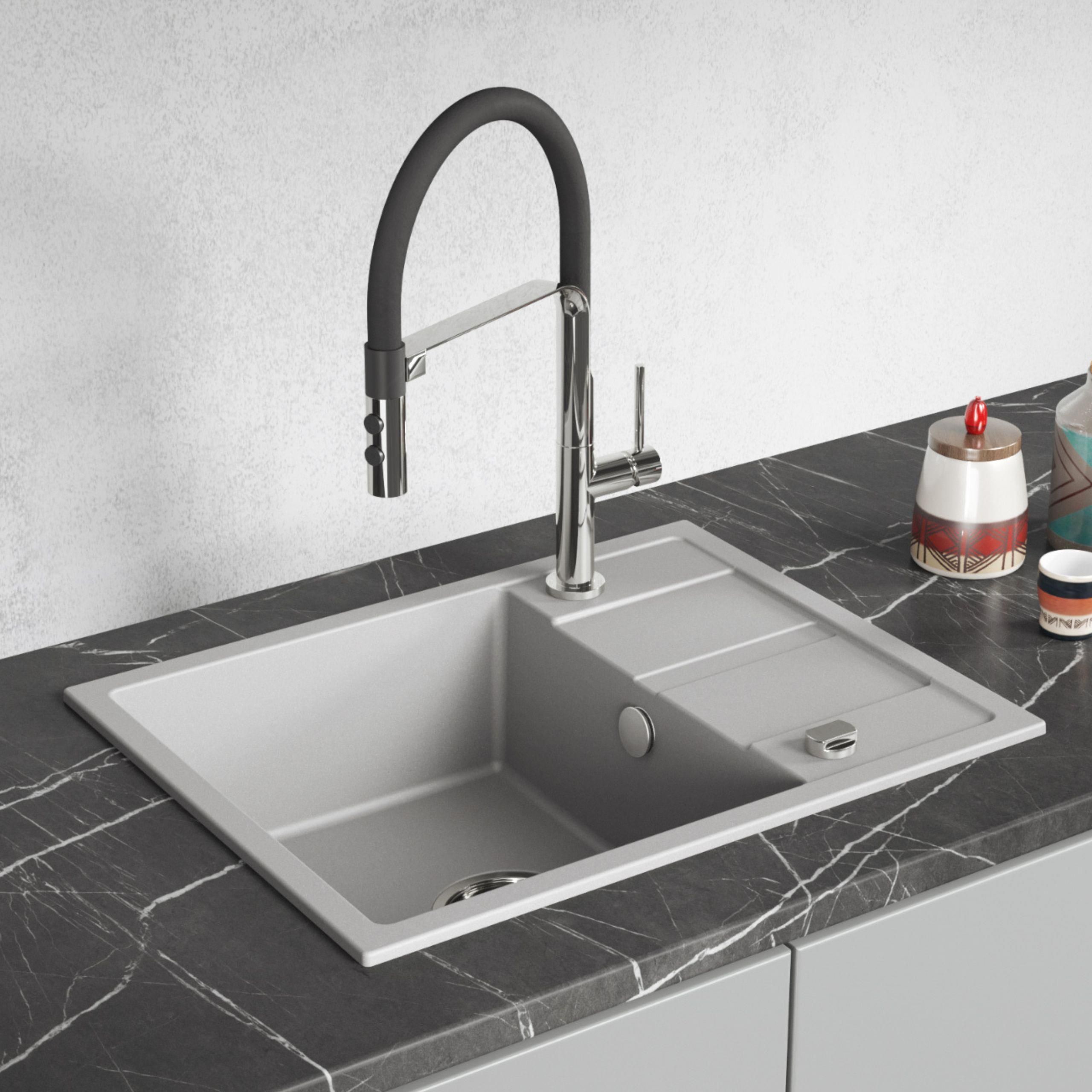 Zlewozmywak granitowy 1 komora z półociekaczem Specyfikacje: Wykończenie: Szare Do szafki min.: 50 cm Model: 1-komorowy, Prostokątny Fabrycznie wycięte otwory pod baterię: Tak Szerokość całkowita: 440mm Długość całkowita: 560mm Głębokość całkowita: 175mm Głębokość komory: 160mm Odwracalny: Tak Rodzaj korka: Manualny Przyłącze do zmywarki: Tak Liczba komór: 1 Odporny na szok termiczny: Tak Odporny na wysoką temperaturę: Tak, do 250°C Odporny na przebarwienia: Tak Odporny na uderzenia: Tak Odporny na zarysowania: Tak Opis: Zlewozmywak Granitowy Viti z półociekaczem w szarym kolorze – Nowoczesność i Styl Zlewozmywak granitowy Viti w eleganckim szarym kolorze to doskonałe połączenie nowoczesnego designu i wysokiej funkcjonalności. Jego stonowany odcień nadaje kuchni wyjątkowego charakteru, łącząc estetykę z praktycznością. Zaprojektowany z myślą o współczesnych wnętrzach, zlewozmywak Viti świetnie wpasowuje się w różnorodne style aranżacyjne, od industrialnych loftów po skandynawską prostotę. Szary kolor dodaje elegancji, a półociekacz zwiększa funkcjonalność, oferując dodatkową przestrzeń do suszenia naczyń. Szary zlewozmywak Viti to uniwersalny element, który sprawdzi się w każdym wnętrzu, niezależnie od dominującej palety kolorów. Idealnie komponuje się zarówno z jasnymi, jak i ciemnymi akcentami, tworząc harmonijną i nowoczesną przestrzeń. Zlewozmywak ten jest symbolem trwałości i jakości. Wykonany z wytrzymałego granitu, jest odporny na szok termiczny, przebarwienia, zarysowania i wysokie temperatury. Dzięki temu zachowuje swój estetyczny wygląd i funkcjonalność przez wiele lat, będąc niezawodnym elementem każdej kuchni. Produkt został wyposażony w innowacyjny syfon Space Saving, który maksymalnie wykorzystuje przestrzeń pod zlewem, ułatwiając przechowywanie akcesoriów kuchennych. Dodatkowe udogodnienia, takie jak przyłącze do zmywarki czy przelew w komorze, sprawiają, że codzienne prace kuchenne stają się bardziej komfortowe. Szary zlewozmywak granitowy Viti to idealny wybór dla tych, którzy cenią sobie nowoczesny design i wysoką funkcjonalność, jednocześnie dbając o estetykę i trwałość swojej kuchni.