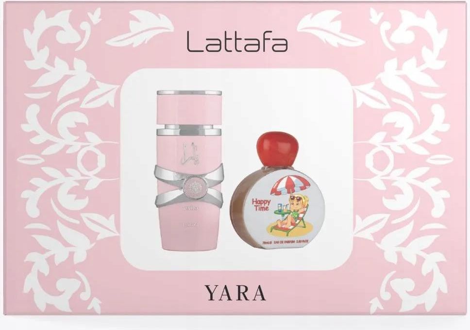 Lattafa zestaw perfum Yara + Pride Kids Lattafa Yara woda perfumowana damska 100 ml Lattafa Yara EDP to woda perfumowana o pojemności 100 ml, skomponowana z nut orientalno-kwiatowych, przeznaczona dla kobiet i wprowadzona na rynek w 2020 roku. Zapach ten opisuje się jako wyrafinowany i elegancki, łączący w sobie słodycz i nuty piżmowe. Kompozycja otwiera się świeżymi nutami głowy: mandarynki, heliotropu i orchidei. Serce zapachu tworzy akord gourmand i egzotyczne owoce, a bazę stanowią wanilia, sandałowiec i piżmo. Kompozycja zapachowa Nuty głowy: mandarynka, heliotrop, orchidea. Nuty serca: akord gourmand, owoce tropikalne. Nuty bazy: wanilia, sandałowiec, piżmo. Lattafa Kids Happy Time woda perfumowana dla dzieci 75 ml Woda perfumowana, będąca częścią kolekcji dla dzieci, jest idealna dla małych poszukiwaczy przygód, tworząc radosną i magiczną aurę z każdym psiknięciem. Świętuj radość dzieciństwa z Happy Time marki Lattafa Pride, zapachem zaprojektowanym tak, aby uchwycić cudowność i wesołość młodości. Kompozycja zapachowa Nuty głowy: mandarynka. Nuty serca: plumeria, gardenia, jaśmin. Nuty bazy: kokos, piżmo, paczula.