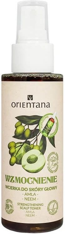 Kosmetyki ORIENTANA to kosmetyki naturalne bez parabenów, pochodnych ropy naftowej (parafiny, oleju mineralnego, wazeliny), silikonów, PEGów, szkodliwych barwników i sztucznych zapachów. Kosmetyki oraz surowce, z których są tworzone nie są testowane na zwierzętach. Nie zawierają surowców zwierzęcych, wyjątek stanowi wosk pszczeli, kozie mleko i śluz ślimaka - pozyskiwane bez szkody dla zwierząt. Stosowane są tylko naturalne, nieprzetworzone ekstrakty roślinne: tłoczone na zimno oleje roślinne, masła roślinne, świeże ekstrakty roślinne. Tak przygotowane kosmetyki, nie tracą swoich cennych wartości. Dzięki temu produkty przywracają naturalne funkcje skóry, pobudzają jej metabolizm i odbudowę. Nie podrażniają i nie uczulają.Część z naszych kosmetyków przygotowywana jest ręcznie, w oparciu o sprawdzone receptury i wiedzę tradycyjnej medycyny azjatyckiej.  Naturalny tonik do wzmocnienia włosów stworzony według zasad ajurwedy. 99,8% składników pochodzenia naturalnego. Bezolejowa kuracja na wzmocnienie włosów, nie wymaga spłukiwania. Buteleczka z atomizerem – do codziennego stosowania. DZIAŁANIE AJURWEDYJSKIEGO TONIKU DO WŁOSÓW: wzmocnienia włosy, zapobiega wypadaniu, stymuluje wzrost nowych włosów, odświeża skórę głowy, działa przeciwbakteryjnie, zmniejsz przetłuszczanie się skóry głowy. Bogaty w zioła indyjskie takie jak: AMLA (Embfica Officinalis)- sprawia, że włosy stają się sprężyste, zdrowe, błyszczące. Będziesz mieć wrażenie, że włosy są odżywione od środka. NEEM (Melia Azadirachta) – działa przeciwzpalnie, wzmacnia cebulki włosów. GOTU KOLA (Centella Asiatica) – wzmacnia skórę głowy, przyspiesza wzrost włosów. BHINGRAJ (Eclipta Alba) – intensyfikuje wzrost włosów. KOZIERADKA (Trigonella Foenum-Graecum) – intensyfikuje wzrost włosów. TYMIANEK (Thymus Serpyllum) – hamuje wypadanie włosów. ALOES – działa nawilżająco. LOTOS TYGRYSI (Nymphaea Lotus) – wzmacnia włosy. ROZMARYN – działa przeciwbakteryjnie, zmniejsza przetłuszczenie, wzmacnia włosy.