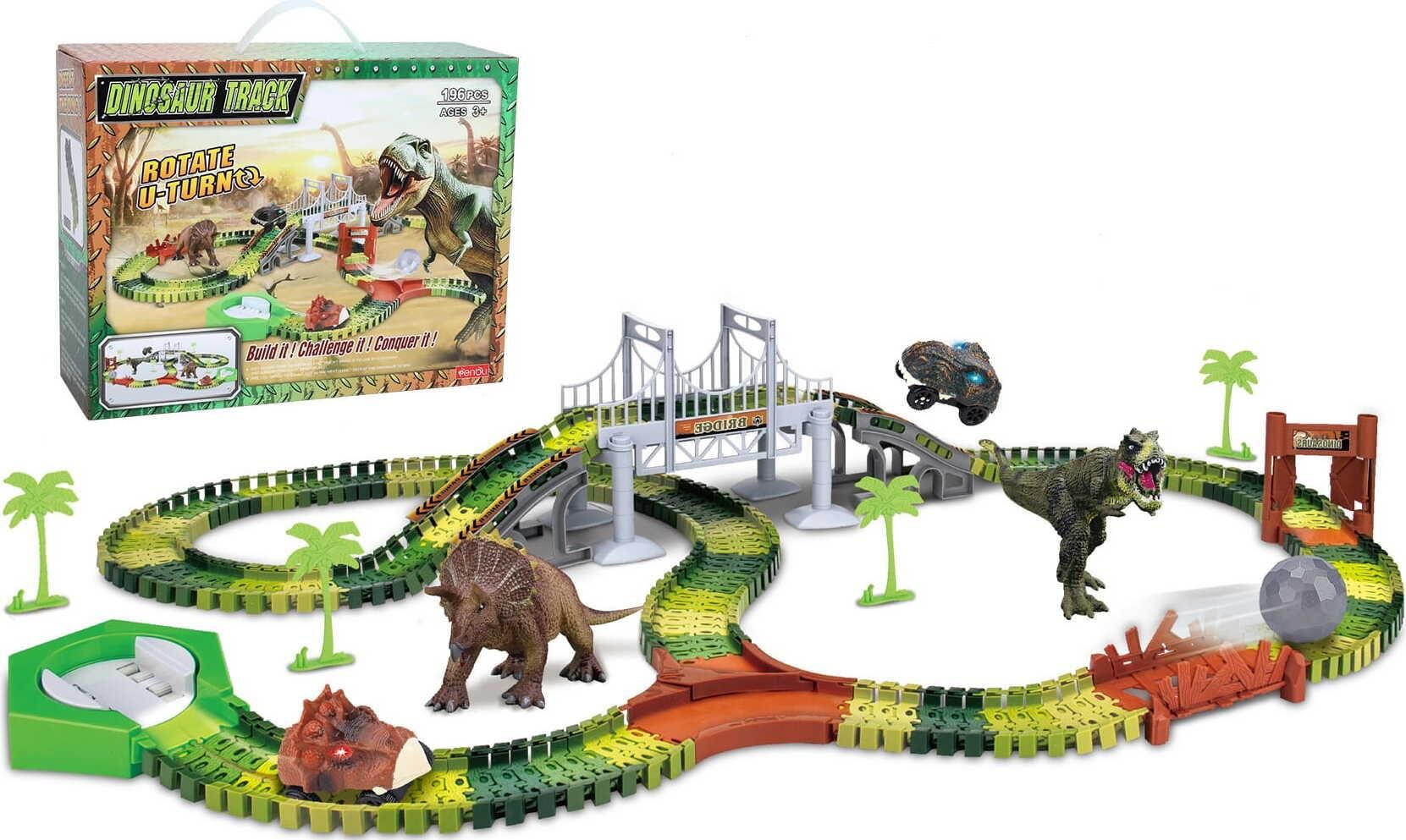 Tor wyścigowy samochodowy dla dzieci Duży Dinozaur 196 el Dinozaury Auto Sun Baby Cechy produktu wiek: 3+ ilość elementów: 196 zestaw zawiera: tory, most, 4 drzewa, 2 figurki dinozaurów, samochód w kształcie głowy dinozaura, 1 pole startowe, drzwi, głaz, , 1 rozdzielnia, kładka, naklejki, …