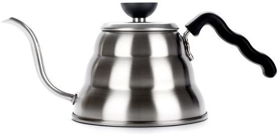 Hario Buono Kettle to najlepszy przyjaciel baristy, w postaci praktycznego dzbanka służącego do gotowania wody. Ze względu na swą precyzję, jest szczególnie przydatny przy zaparzaniu kawy metodami alternatywnymi jak Drip, Chemex czy Aeropress. Wyprofilowana szyjka zapewnia pełną kontrolę nad strumieniem wody. Dzięki temu masz wpływ na tempo oraz miejsce, w które kierujesz wodę. Minimalistyczny i industrialny design, oraz precyzja nalewania zdecydowanie wyróżniają Buono Kettle na tle innych czajników. Solidna konstrukcja ze stali nierdzewnej z elementami z tworzywa sztucznego czynią Buono Kettle czajnikiem na długie lata. Dodatkową zaletą jest to, że może on być używany na wszystkich rodzajach płyt grzewczych. Jego wygląd i funkcjonalność zostały docenione w 2009 roku podczas międzynarodowej wystawy World Tea Expo, gdzie Buono Kettle wygrał w kategorii najlepszego nowego produktu. Pojemność całkowita: 1l Dostępna jest również wersja elektryczna 0,8l: Hario Buono Electric Kettle. Średnica całkowita dna to 14,4 cm, natomiast średnica powierzchni styku z podłożem to 12,5cm. Poniższy film przedstawia przykładowe użycie Hario Buono Kettle w parze z Chemexem: