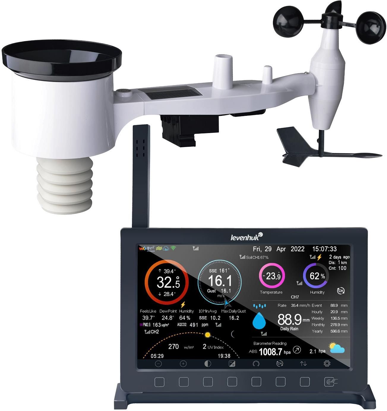 Stacja pogodowa Levenhuk Wezzer PRO LP500 zapewnia kompleksowe informacje o pogodzie, a także umożliwia monitorowanie temperatury i wilgotności w pomieszczeniach. Korzystając ze zdalnego czujnika radiowego 9 w 1, stacja pogodowa rejestruje również ciśnienie atmosferyczne, prędkość i kierunek wiatru, punkt rosy, indeks ciepła, indeks UV i natężenie oświetlenia. Interesującą cechą tej stacji jest to, że raportuje ona nie tylko zmierzoną temperaturę, ale także tę odczuwaną przez człowieka (parametr „Feels like"). Dostępna jest funkcja prognozy pogody. Stacja ma również budzik i kalendarz z fazami Księżyca. Dzięki prostym i wygodnym elementom sterującym oraz ergonomicznej konstrukcji urządzenie zapewnia profesjonalną funkcjonalność, a jednocześnie doskonale nadaje się do użytku domowego. Stacja nie tylko wskazuje bieżące dane, ale także przechowuje historię obserwacji, przedstawia wykresy zmian, rejestruje minimalne i maksymalne odczyty oraz ostrzega o niskich i wysokich wynikach (w stosunku do wartości referencyjnych ustawionych przez użytkownika). Urządzenie umożliwia zainstalowanie karty pamięci o pojemności do 32 GB lub łączenie się z aplikacjami pogodowymi przez Wi-Fi w celu przesyłania danych: w tym celu potrzebny jest router w odległości nie większej niż 50 metrów od jednostki głównej stacji. Dane można przeglądać na ekranie smartfona (wymagana jest aplikacja na urządzenia przenośne). Wszystkie dane są wyświetlane na kolorowym ekranie LCD z wygodną segmentacją informacji. Jednostka główna stacji jest zasilana poprzez zasilacz sieciowy. Czujnik bezprzewodowy jest zasilany bateriami, a także wykorzystuje panel słoneczny. Panel słoneczny służy jedynie jako źródło zasilania i nie ładuje baterii. Baterie są sprzedawane osobno, a specjalny wskaźnik informuje o ich niskim poziomie i konieczności wymiany. Najważniejsze właściwości Profesjonalna stacja meteorologiczna z radiowym czujnikiem bezprzewodowym Duża dokładność pomiaru, pełny zakres parametrów do oceny pogody na zewnątrz i mikroklimatu wewnątrz pomieszczeń Zapisywanie historii odczytów, wykresy zmian, minimalne i maksymalne wartości odczytów, prognoza pogody System ostrzegania o stosunkowo wysokich i niskich odczytach Łączność Wi-Fi z aplikacjami pogodowymi i aplikacjami na urządzenia przenośne, kompatybilność z kartami pamięci do 32 GB Wbudowany kalendarz z fazami Księżyca i budzik Kolorowy ekran z regulowanym podświetleniem i wygodnym układem informacji Kompaktowa konstrukcja i wygodne elementy sterujące Uwaga: w przypadku internetowych usług meteorologicznych użytkownik zobaczy tylko podstawowe zewnętrzne parametry pogodowe (w zależności od usługi internetowej, z której korzysta). Zawartość zestawu Stacja meteorologiczna Wielofunkcyjny zdalny czujnik 9 w 1 Wiatrowskaz anemometru Zasilacz sieciowy Pierścień uszczelniający Instrukcja obsługi i karta gwarancyjna Marka Levenhuk, Inc., USA Gwarancja bezterminowa EAN 5905555019123 Rozmiar opakowania (dł. x szer. x gł.) 44x17x27 cm Masa przesyłki 1.9 kg Miejsce użytku na zewnątrz, wewnątrz Typ stacja meteorologiczna Wbudowane funkcje anemometr, barometr, budzik, deszczomierz, higrometr, kalendarz, termometr, zegar Konstrukcja bezprzewodowa, cyfrowy, mocowana do ściany, stołowy Zastosowanie do użytku profesjonalnego === Ogranicznik === Barometr (ciśnienie atmosferyczne) Jednostki miar hPa, inHg, mmHg Zakres pomiarowy 300-1100 hPa Rozdzielczość pomiaru 0,1 Dokładność pomiaru ±5 hPa (przy ciśnieniu poniżej 700-1100 hPa) Zastosowanie wykres zmian, wykrywanie wartości minimalnych i maksymalnych === Ogranicznik === Higrometr (wilgotność powietrza) Jednostki miar % (RH - wilgotność względna) Zakres pomiarowy 10% do 99% Rozdzielczość pomiaru 1% Dokładność pomiaru ±5% Zastosowanie alerty niskiej/wysokiej wilgotności, historia pomiarów === Ogranicznik === Termometr (temperatura) Jednostki miar °C, °F Zakres pomiarowy, wewnątrz −10...+60 °C (14...140 °F) Zakres pomiarowy, na zewnątrz -40...+60 °C Rozdzielczość pomiaru 0.1 °C Dokładność pomiaru ±0,3 °C Zastosowanie alarm niskiej/wysokiej temperatury === Ogranicznik === Zegar (godzina/data/kalendarz) Zegar yes Format czasu 12-godzinny, 24-godzinny Kalendarz yes Budzik yes Zastosowanie strefa czasowa === Ogranicznik === Anemometr (prędkość wiatru) Jednostki miar km/h, m/s, mph, węzły Zakres pomiarowy od 0 do 50 m/s Dokładność pomiaru ±1 m/s (dla prędkości wiatru < 5 m/s), ±10% (dla prędkości wiatru ≥ 5 m/s) Zastosowanie alarmowanie o porywistym wietrze, skala Beauforta, zapis maksymalnej prędkości porywów wiatru, zapis maksymalnej prędkości wiatru === Ogranicznik === Anemometr (kierunek wiatru) Jednostki miar stopnie Zakres pomiarowy 0-360° Dokładność pomiaru ±15° Zastosowanie róża wiatrów === Ogranicznik === Deszczomierz (opady atmosferyczne) Jednostki miar cale, mm Zakres pomiarowy od 0 do 9999 mm Rozdzielczość pomiaru 0,3 mm (dla opadów < 1000 mm), 1 mm (dla opadów >1000 mm) Dokładność pomiaru ±10 % Zastosowanie przechowywanie odczytów z 1 godz./24 godz./tygodnia/miesiąca/ogółem, przechowywanie wartości maksymalnych === Ogranicznik === Specyfikacja ogólna Typ ekranu kolorowy Liczba ekranów 1 Funkcje ekranu podzielony na segmenty Odstęp między wskazaniami 60 s (w pomieszczeniu), 16 s (na zewnątrz) Częstotliwość sygnału radiowego, MHz 433 Promień sygnału radiowego, m 100 Cykl transmisji danych 1-240 min (możliwość dostosowania) Zasilanie bateria słoneczna, czujnik bezprzewodowy: baterie AA 1,5 V - 2 szt. (sprzedawane osobno), stacja meteorologiczna: 5 V z zasilacza sieciowego Korpus tworzywo sztuczne Wi-Fi yes Zastrzeżenia dotyczące wodoszczelności IPX3, ochrona przed pionowym zachlapaniem wodą Liczba podłączonych czujników zewnętrznych do 8 szt. (1 sztuka w zestawie) Dostępny jest trend pogodowy yes Czujnik bezp